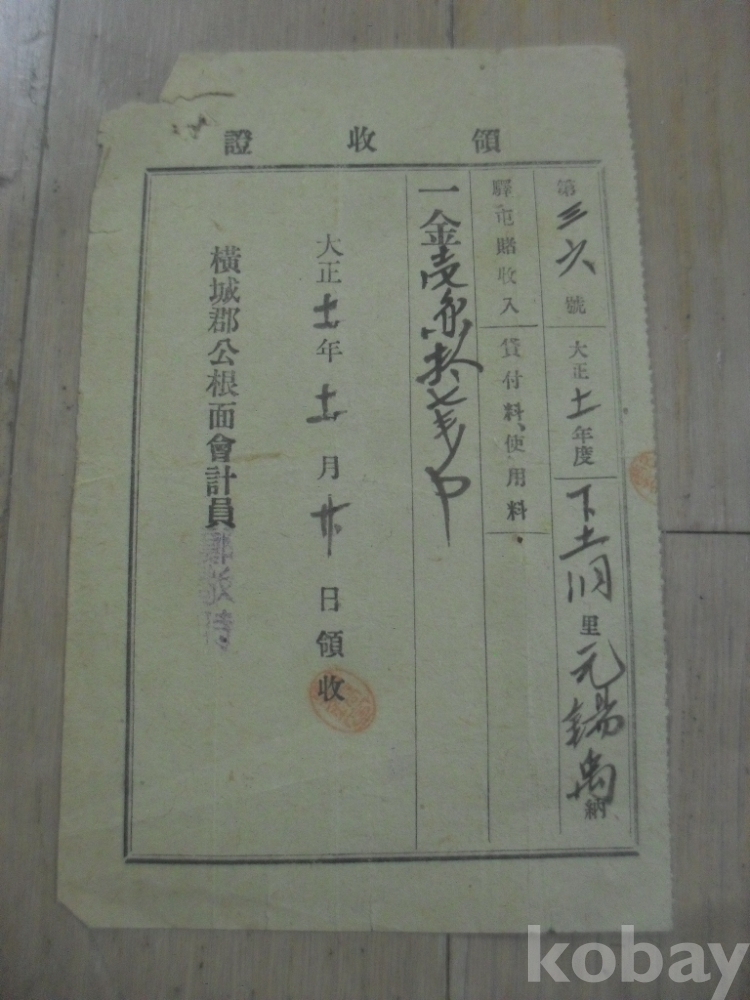 1229h)1922년 횡성군 공근면 驛屯睹收入 貸付料.使用料 영수증.