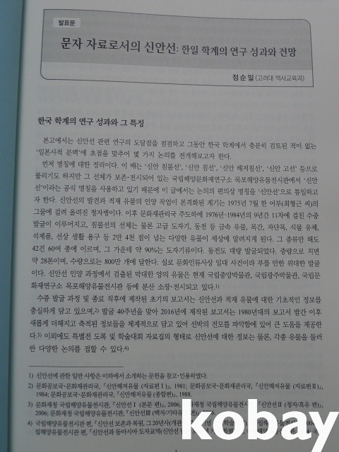 “신안船 ”(전남 新安군에서 발견된 沈沒船이라 하여 이렇게 불려짐) 에 대한 연구 성과.주로 선적된 도자기에 대한 연구와 전시는 많았으나,침몰된 선박 자체에 대한 연구는 그리 많지 않았다 포함일본과 중국의 연구 성과