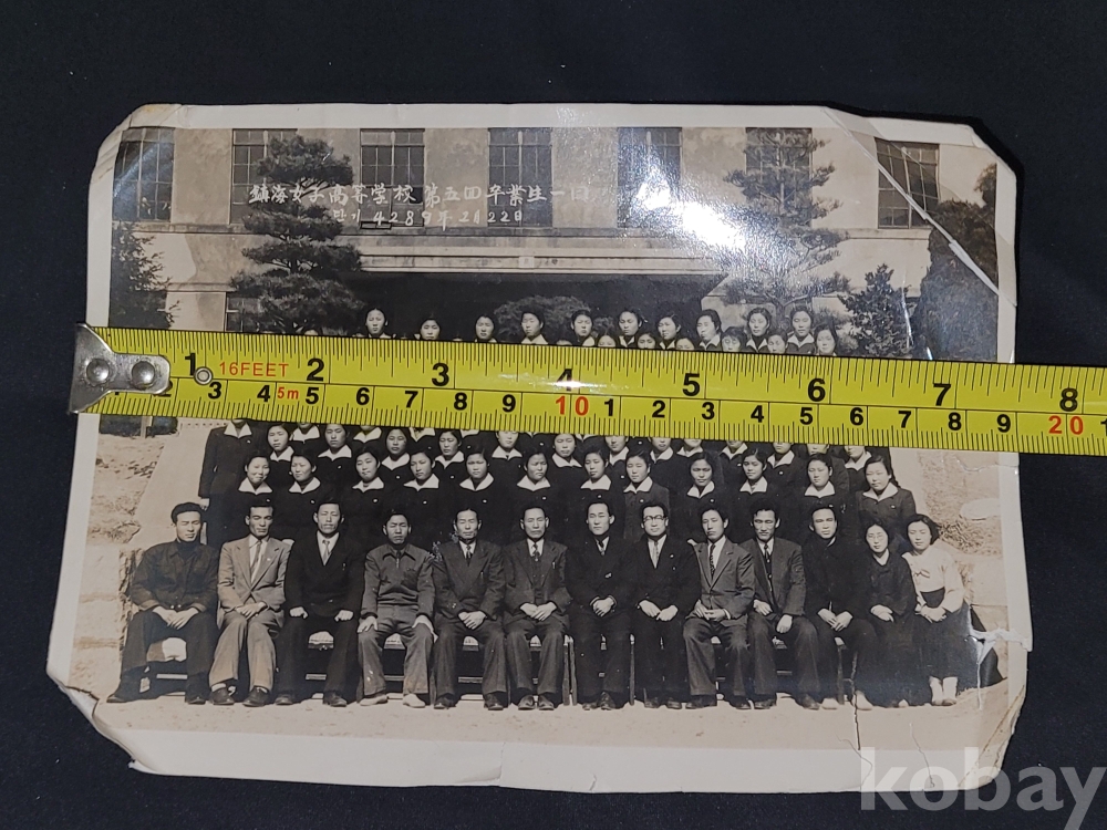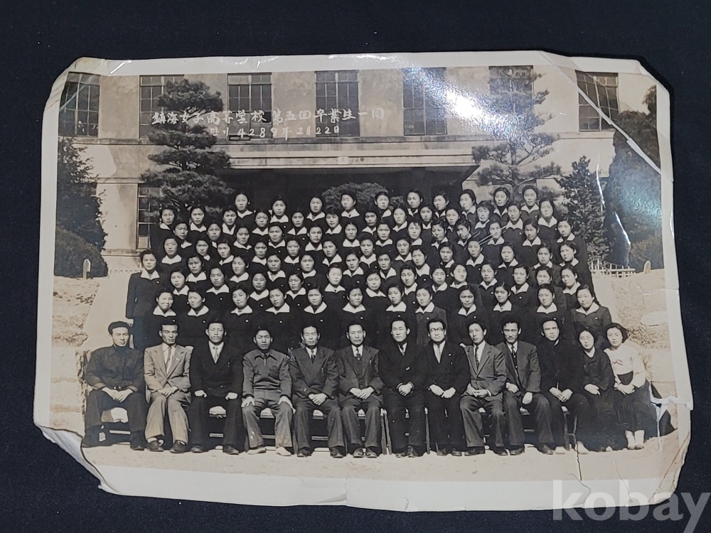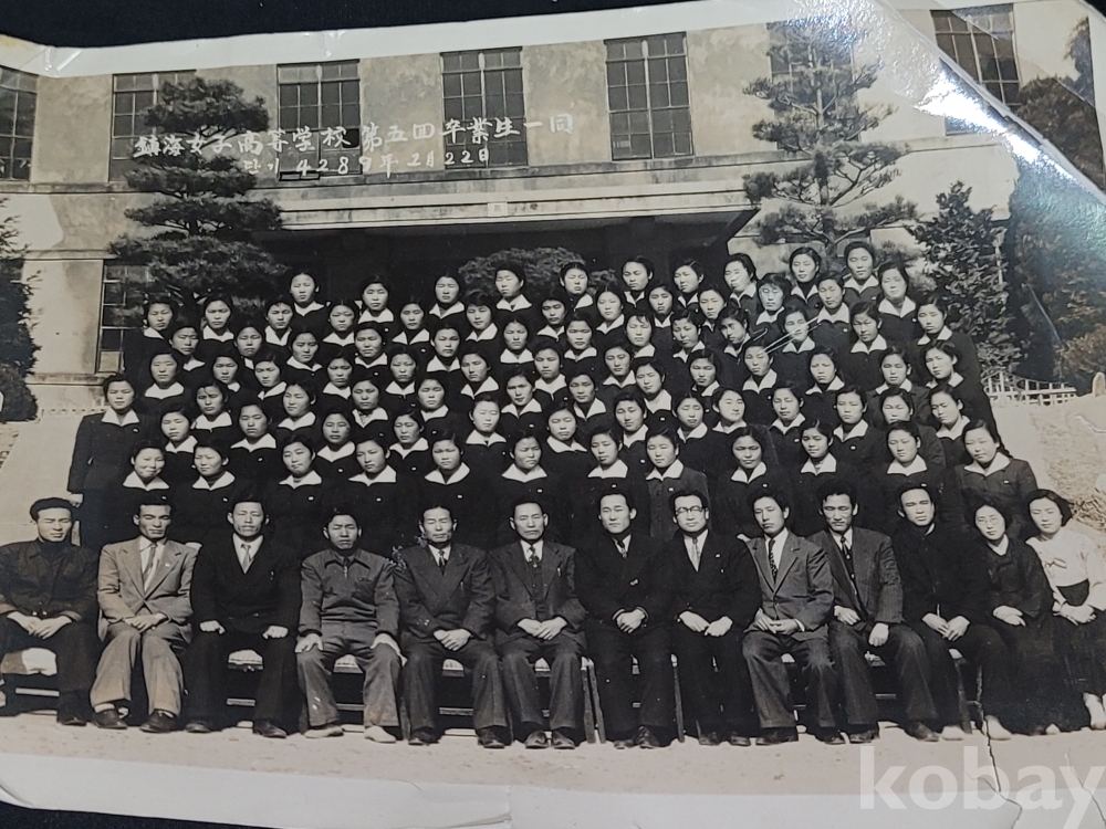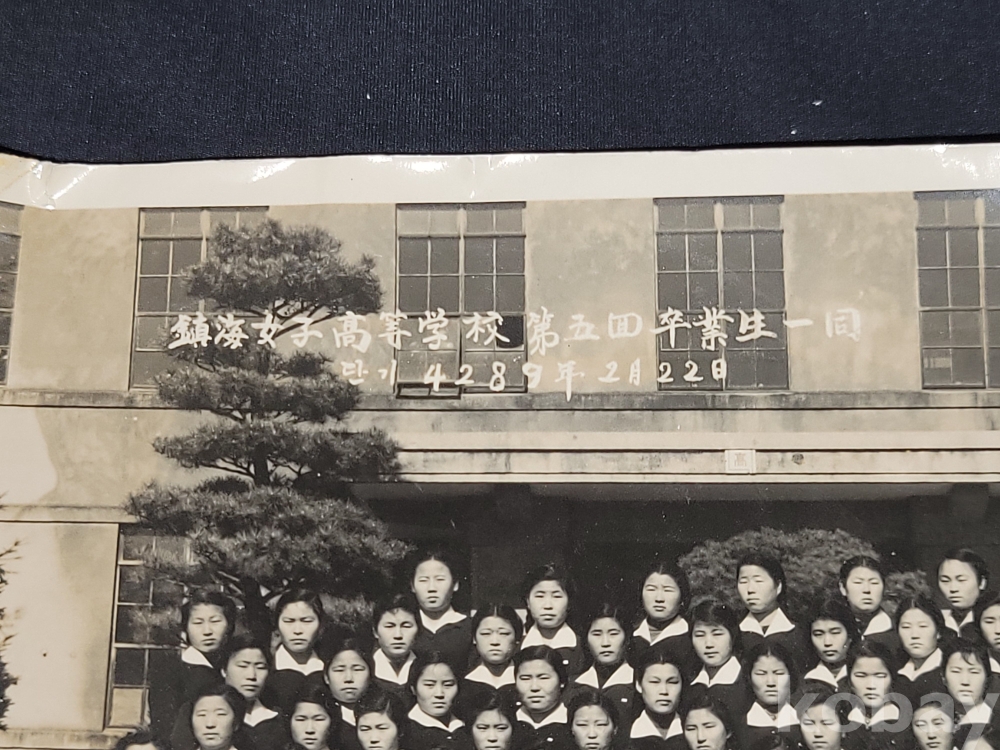 빈티지 세월 감이 느껴지는 1956년 진해여자고등학교 제5회 졸업 기념 단체 흑백사진입니다.