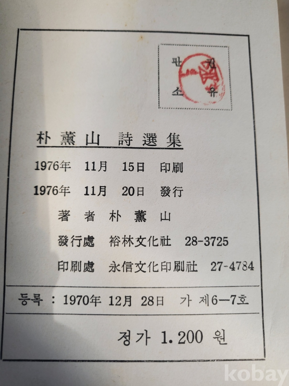 1. 박훈산시선집, 박훈산, 유림문화사, 1976년, 129쪽, 상태 상, 사진 참조