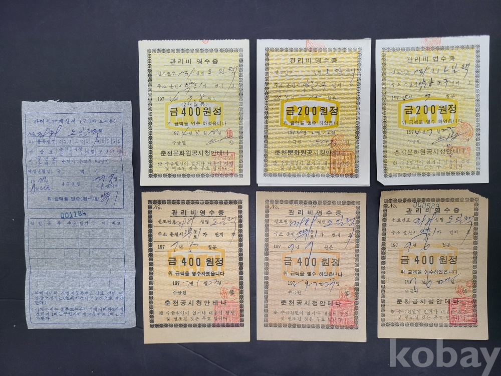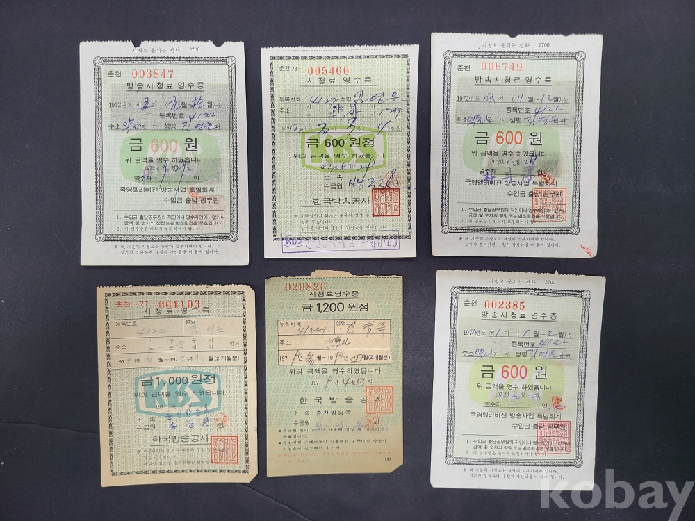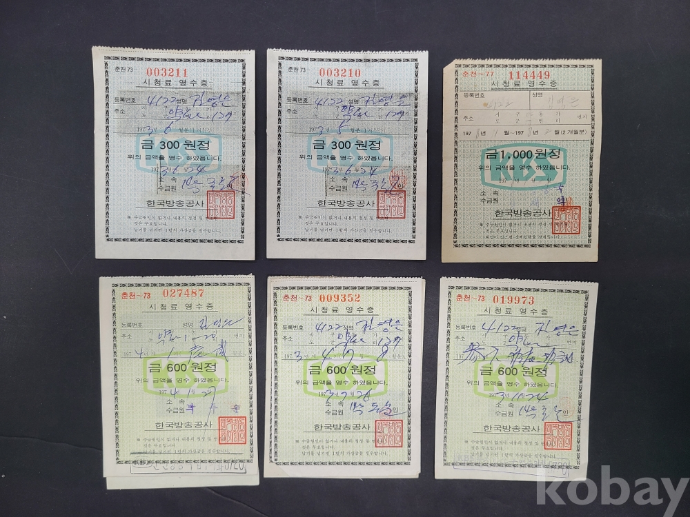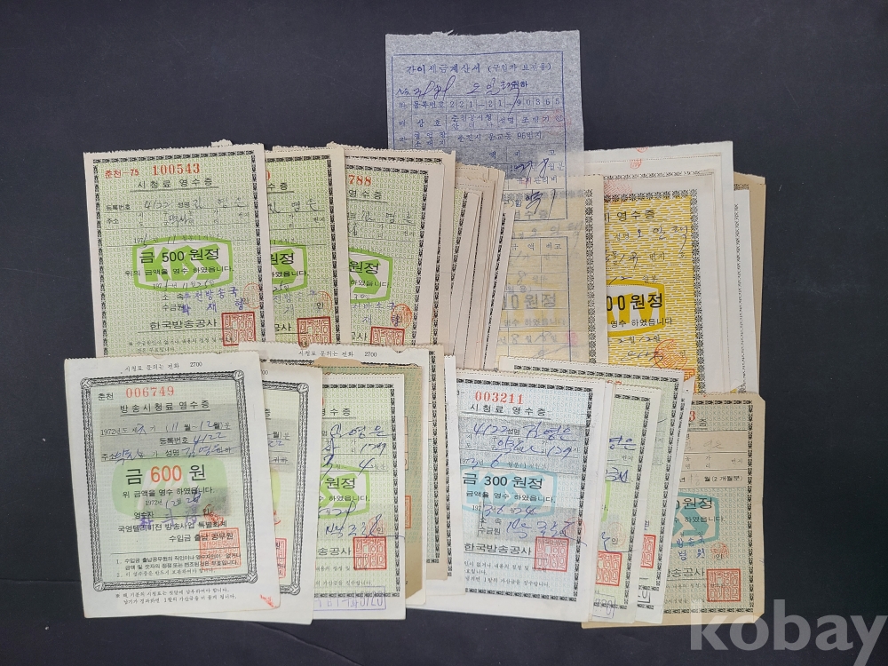 **** 춘천시공시청안테나 관리비 영수증 (200원,400원), 시청료 영수증 (300원,500원,600원,1000원,1200원)