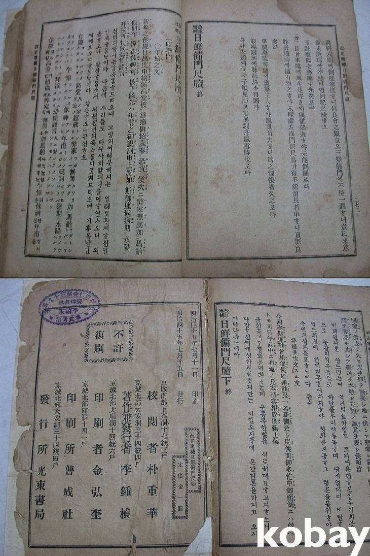 ▒ 박중화 교열/ 이종정 저작 겸 발행, <개정증보 일선비문척독(日鮮備門尺牘)>이다. 명치45년(1912년 7월)에 경성 광동서국(光東書局)에서 나왔다.