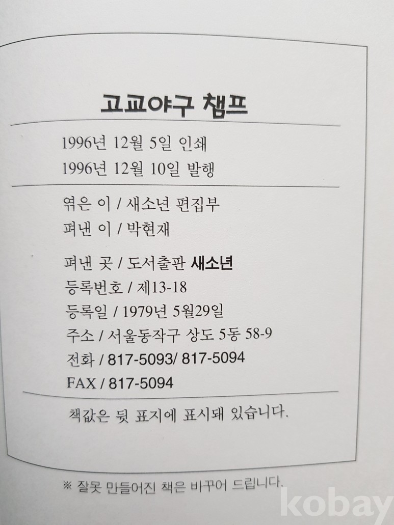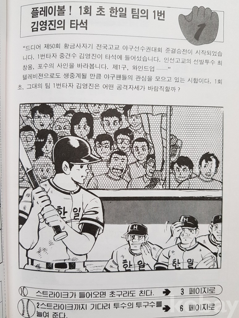 설명: 야구의 재미는 여러분도 잘 알고 있을 것이다. 이 책은 그것을 책의 형태로 맛보게 하려고 계획한 게임북이다. 찬스를 만들고 숨돌릴 틈 없이 공격한다. 또 상태팀의 반격을 최호한으로 막아야 한다. 이건 것들을 실제로 겪는 듯이 박진감 있게 엮은 책 새소년 발행 지금도 많은 이들의 추억을 되살리는 책이다.