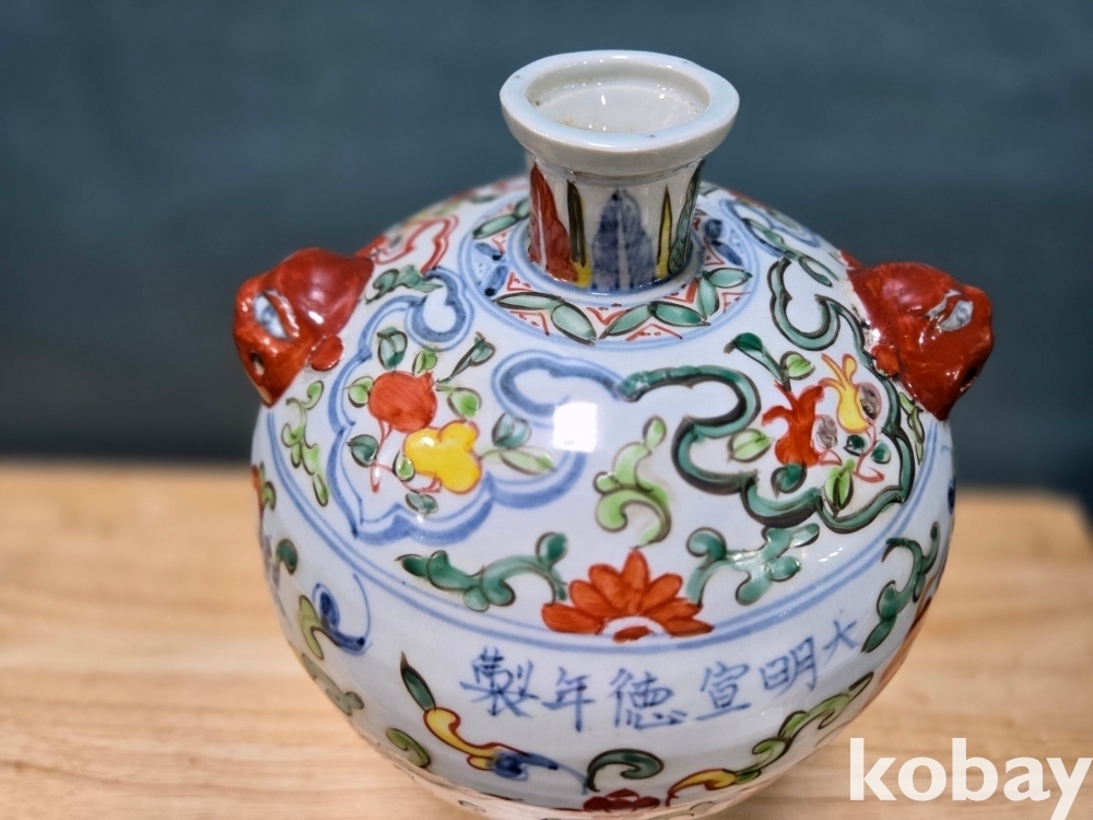 화려한 색상에 용 두마리 표현 매병 도자기 입니다.