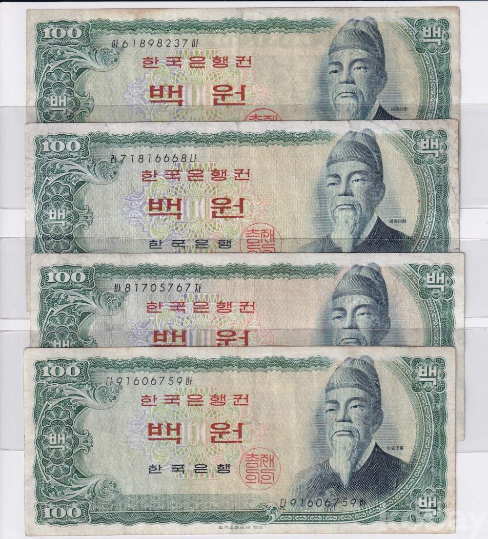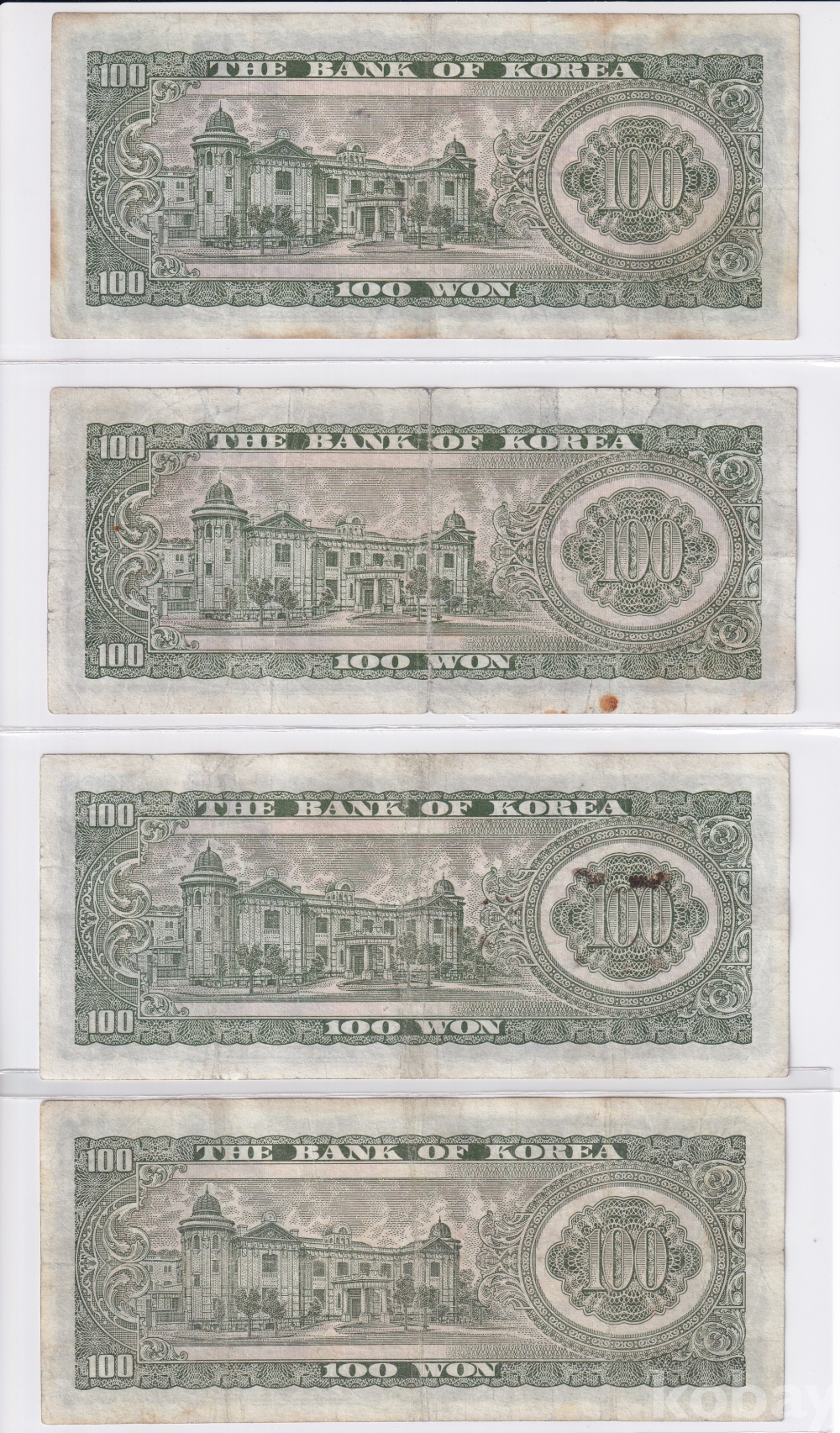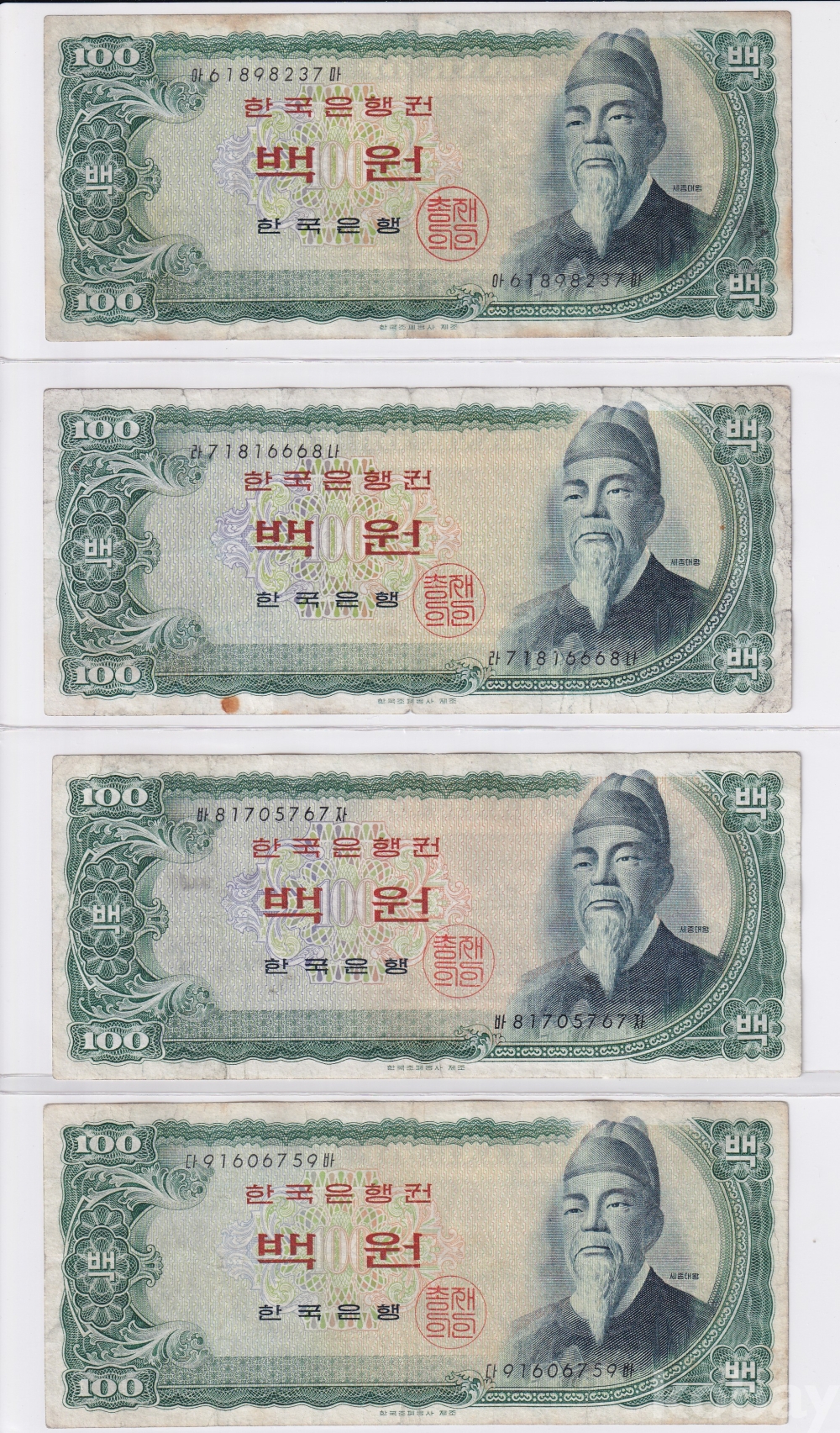 - 한국은행 1965년 세종 백원 줄세우기(6~9) 사용제 지폐-4장 일괄
