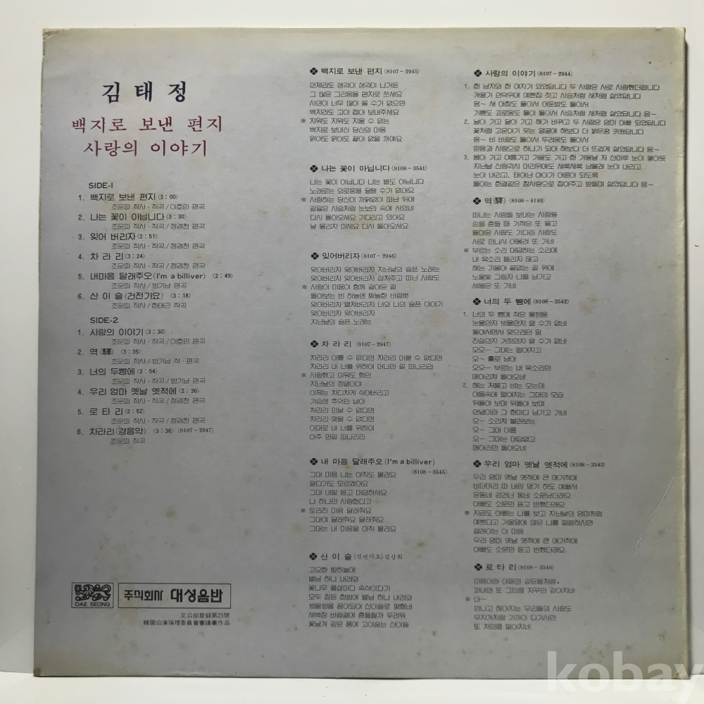 LP 35,050-51 김태정 - 백지로 보낸 편지 . ` 81 대성 자켓 EX 알판 EX