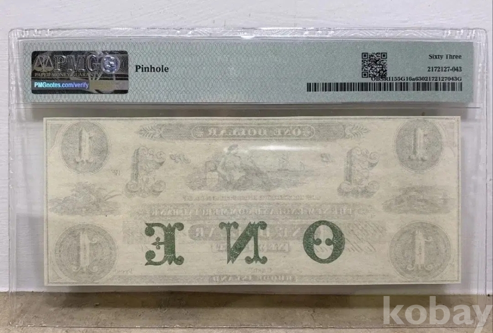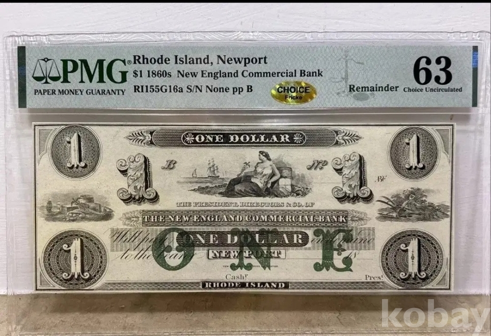 사진 속 지폐는 1860년대 로드아일랜드 뉴포트의 뉴잉글랜드 상업은행(New England Commercial Bank)에서 발행된 1달러 지폐입니다. 뉴잉글랜드 상업은행은 1860년대에 활동했던 로드아일랜드의 은행으로, 1792년부터 1866년까지 미국의 성장을 가능하게 했던 "고전 지폐(obsolete notes)"라고 불리는 통화를 발행했으며 본 물품처럼PMG63고등급은 보기 힘듭니다