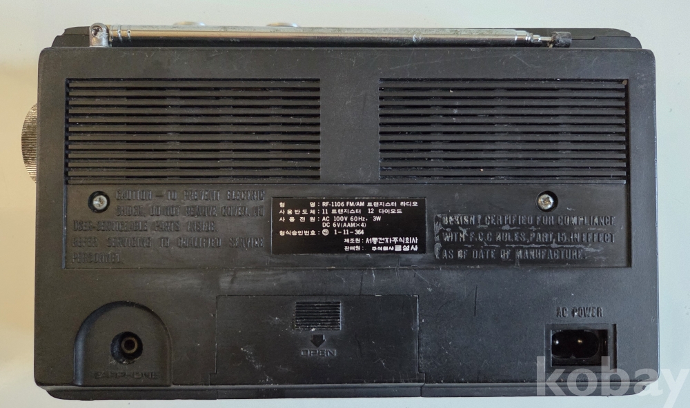 제 품 설 명 | ▣. 1IC 6TR 5다이오드 AM/FM 라디오로 AM/FM 모두 우렁차게 동작합니다. ▣. 동작은 건전지 AC100[V]와 AAM 1.5[V] * 4개 6[V]로 동작. ▣. 안테나와 오른쪽 튜닝 노브 바뀜 이외는 파손된 곳이나 크랙은 없으며, 세월의 흔적으로 페인트 벗겨짐과 얼룩이 있습니다. ▣. 이 모델의 문제점이 건전지 케이스 관리인데 이 라디오는 건전지 홀더가 원형 그대로 보존되었습니다. ▣. 튜닝 레벨 정상적으로 동작하고 기타 부분은 파손이나 크랙은 없습니다. ▣. AM(중파)은 주파수 특성상 밤과 낮 또는 지역에 따라 수신의 편차가 있을 수 있음. ▣ 신용거래를 위해 내부 사진 첨부하였음. ▣ 기타 부분은 오래된 라디오이므로 사진을 충분히 검토하시길 바라오며 미입금 사례가 없으시길 정중히 부탁드립니다. |