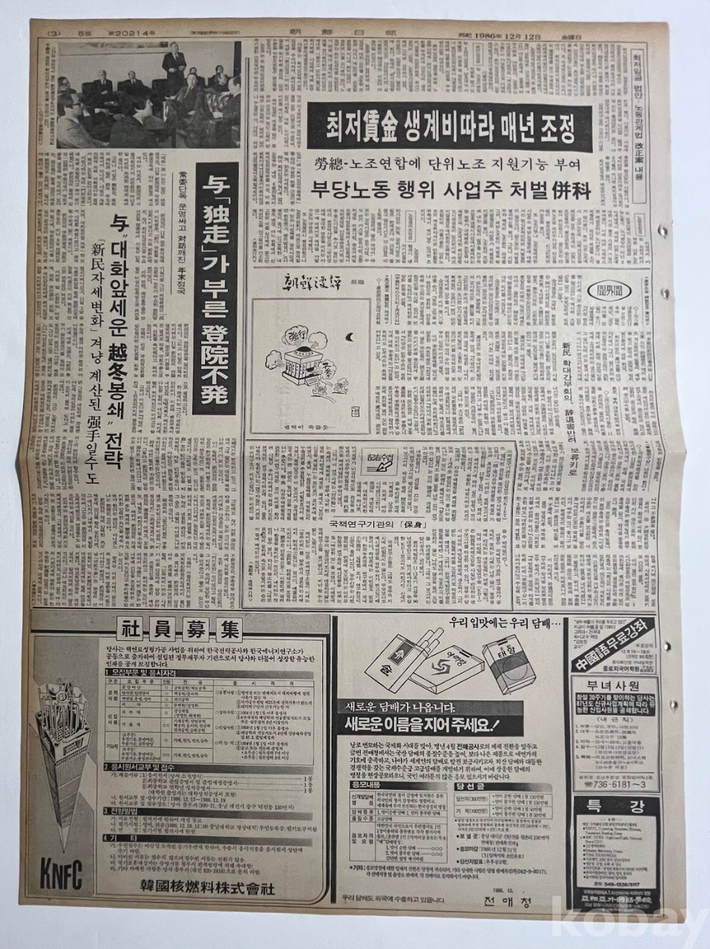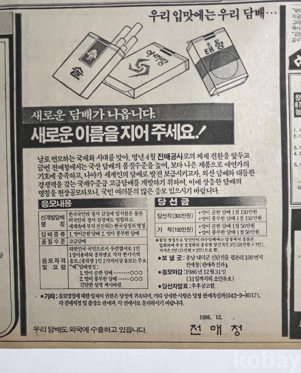 전매청 담배이름 공모가 실린 조선일보 낱장입니다.