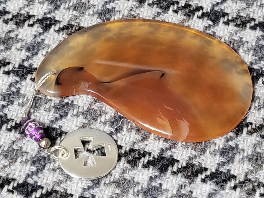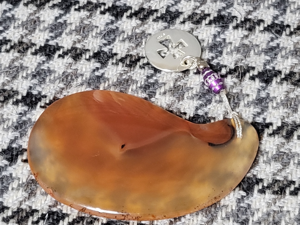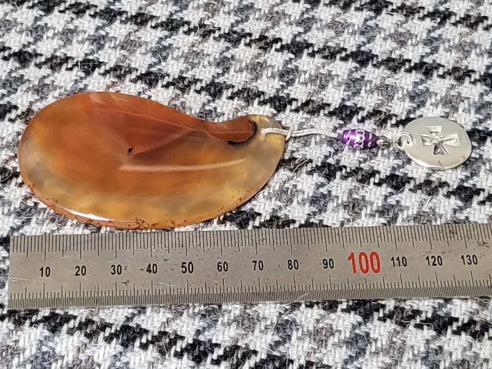 존재감있는 사이즈의 천연 마노원석을 연마하고 은제 고리장식을 매단 노리개 및 선추장식입니다.