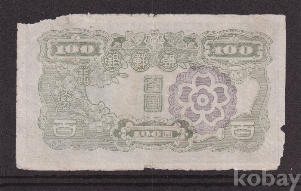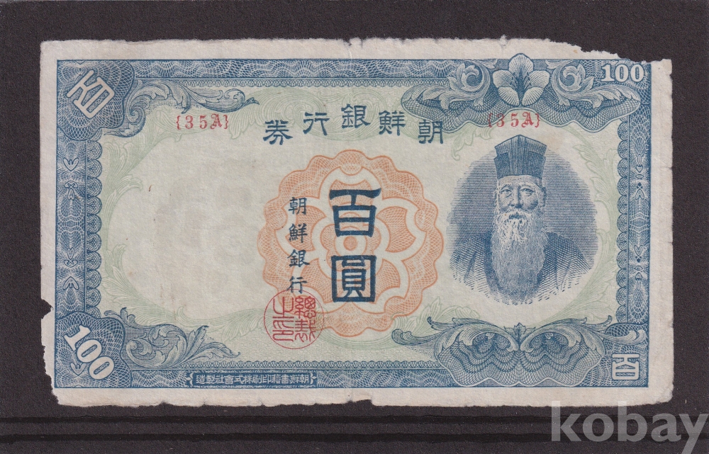 - 조선은행 무백원 백색지 판번호 35A 사용제 지폐