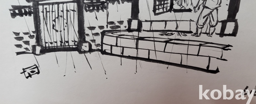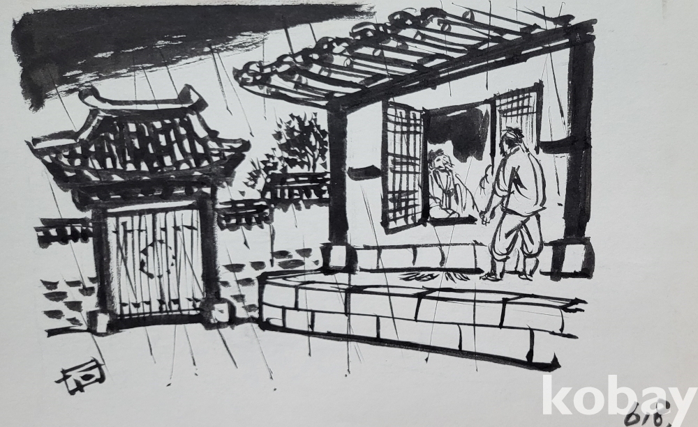 물과 먹으로 만 직접 그려진 수묵화 삽화입니다,