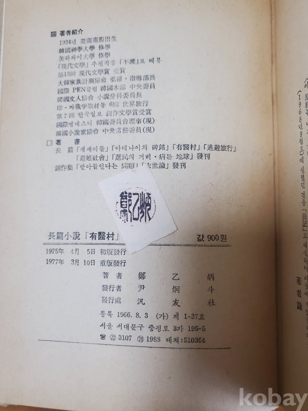 1. 유의촌, 정을병, 범우사, 1977년, 270쪽, 상태 상, 사진 참조