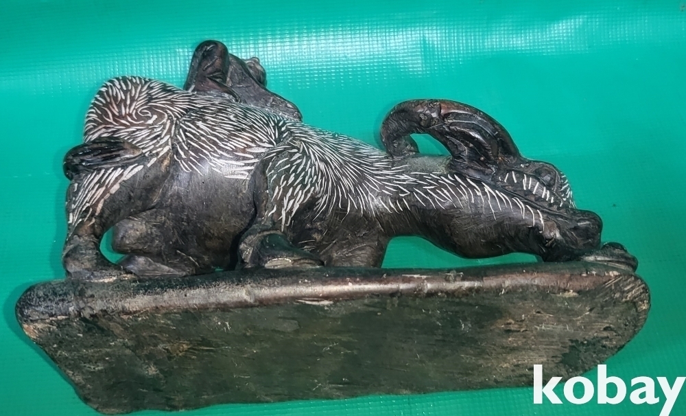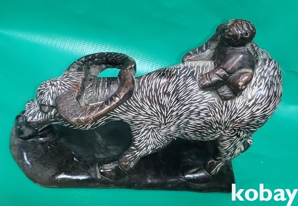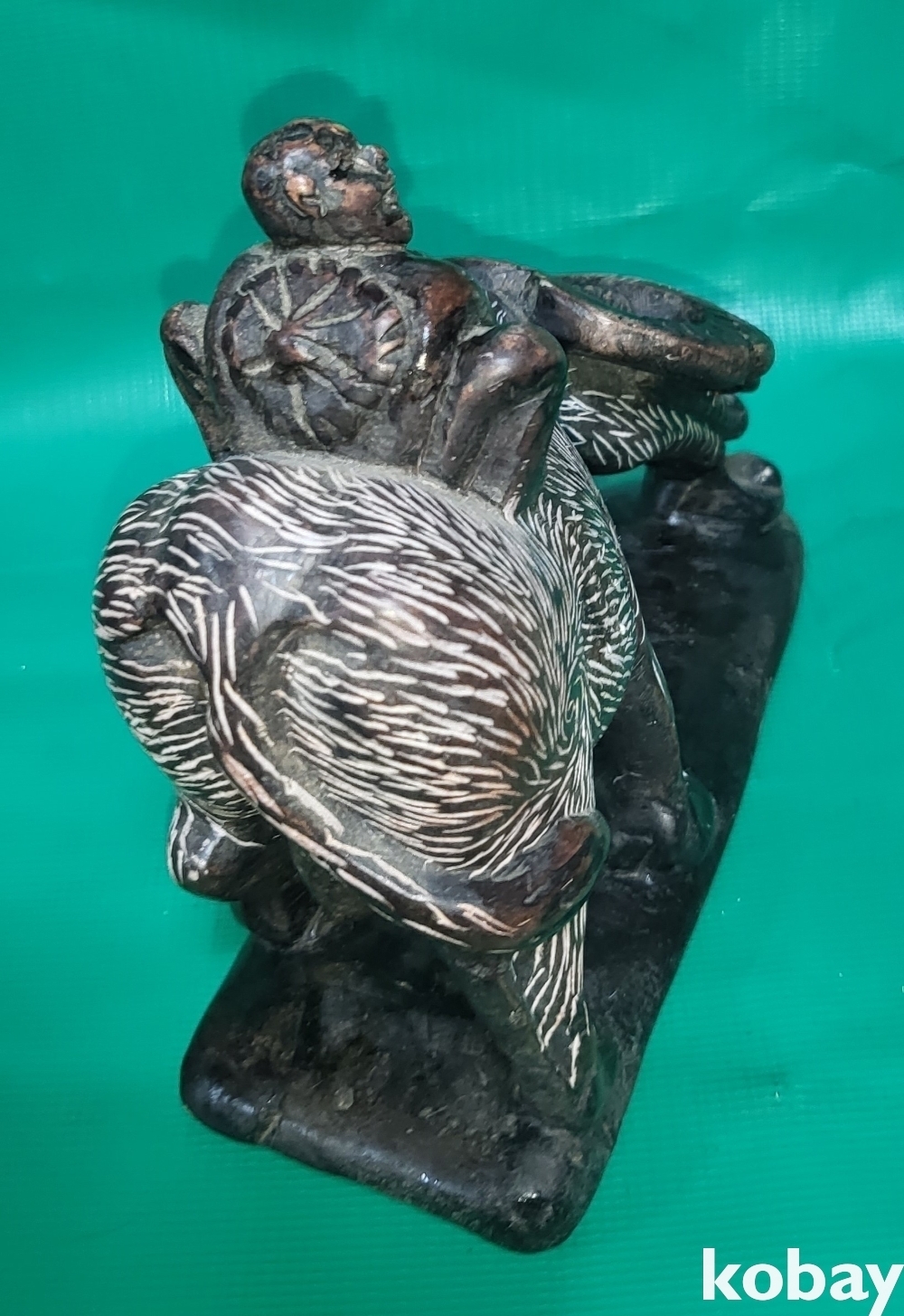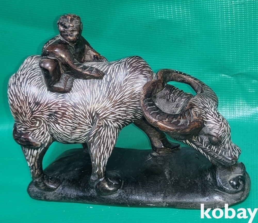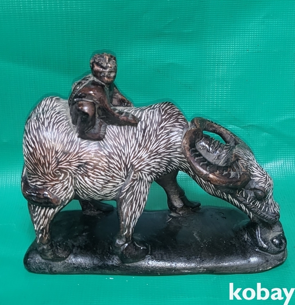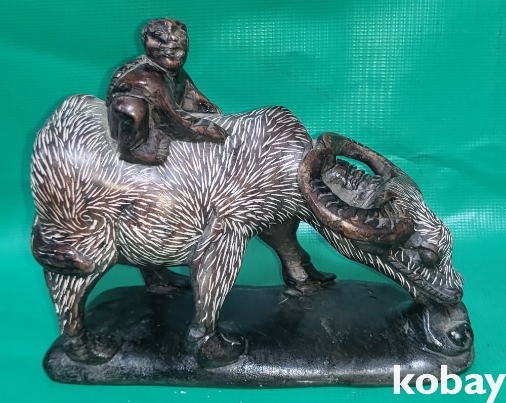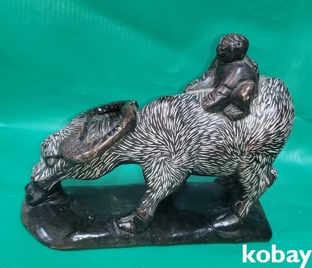돌로 만든 소를 타고 노니는 원숭이 조각품입니다,