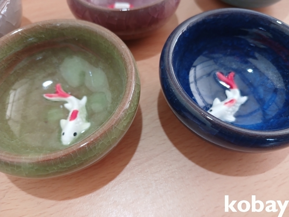 잔 속에 물고기가 입체감 있게 표현된 다기 셋트 입니다.