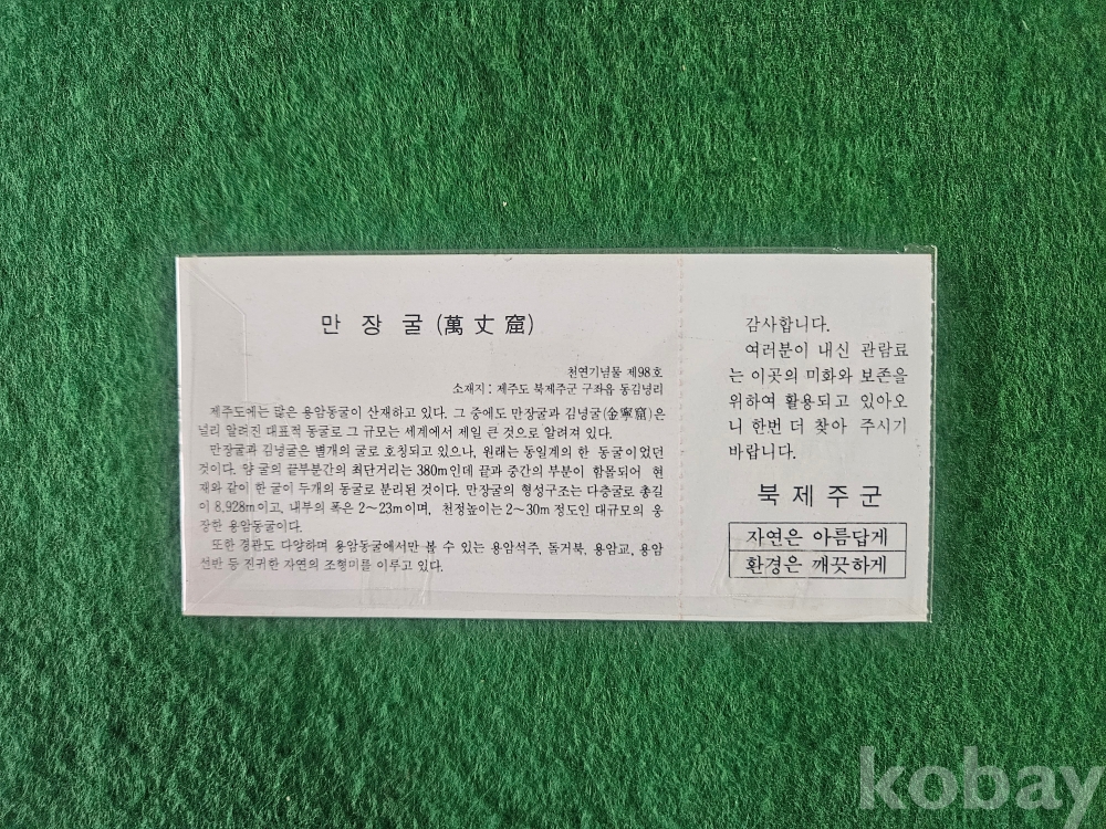 - 관광객용 티켓으로 동굴내부 의 용암기ㅈ둥(석주) 사진이 인쇄되어 있음.