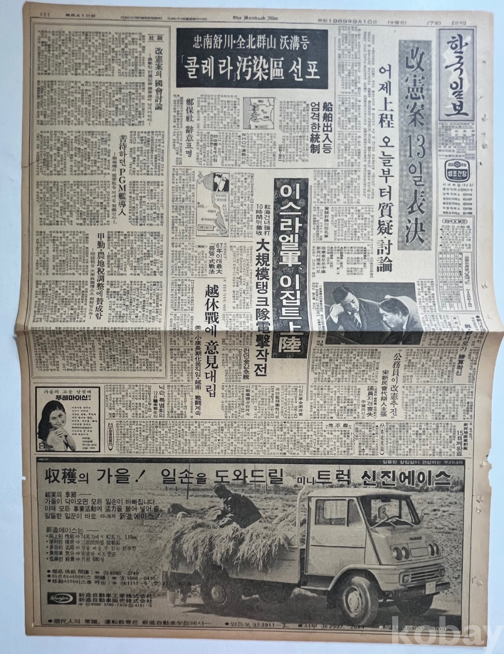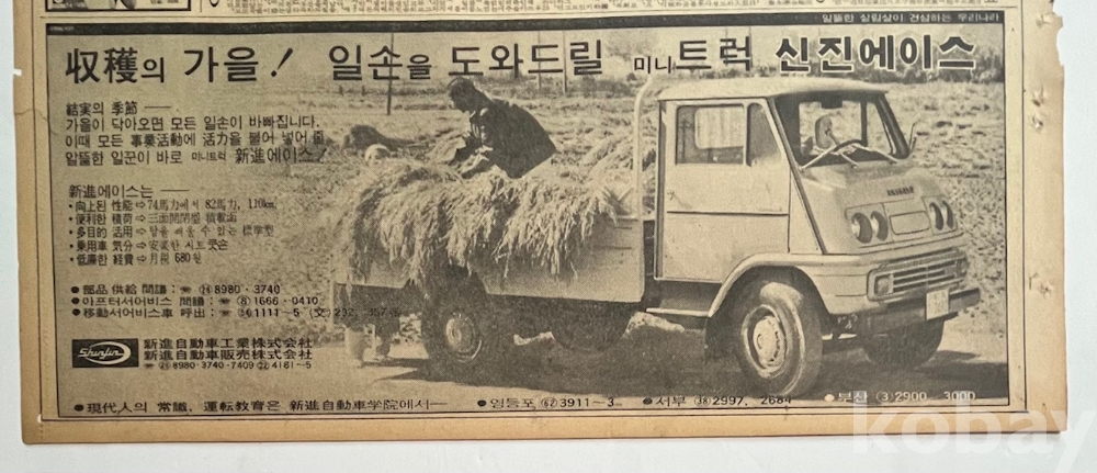 신진에이스 자동차 광고가 실린 한국일보 낱장입니다.