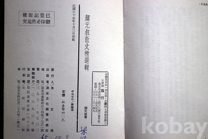 (중국서적) 顔元叔散文精選 (안원숙산문정선) - 1976년. 중국발행...