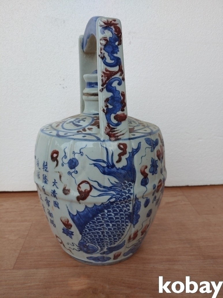 손잡이가 있는 혈연주 술 도자기 입니다.