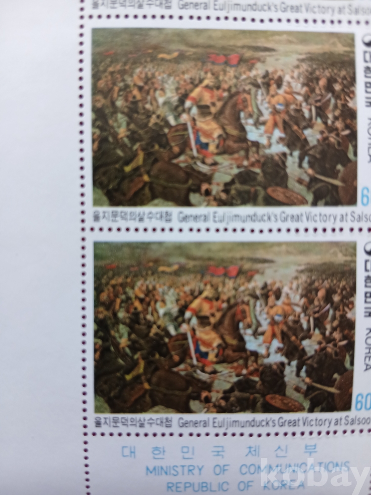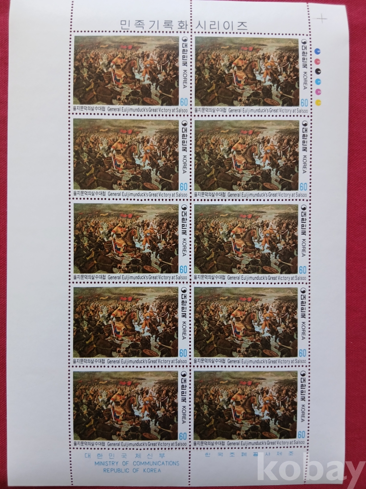 우표: 민속 기록화 시리즈 살수대첩 기념 우표 전지 (1982년 액면가 600원)------미사용으로 상태 아주 양호 합니다