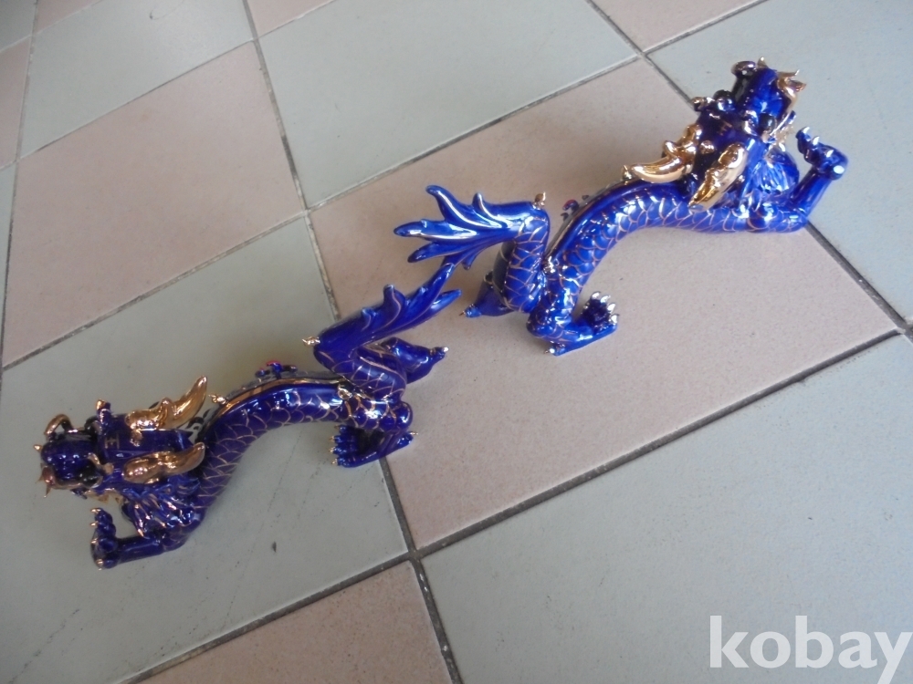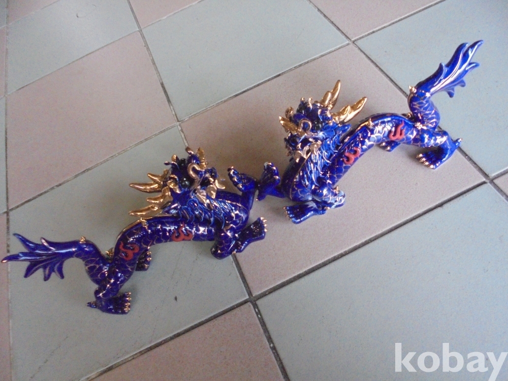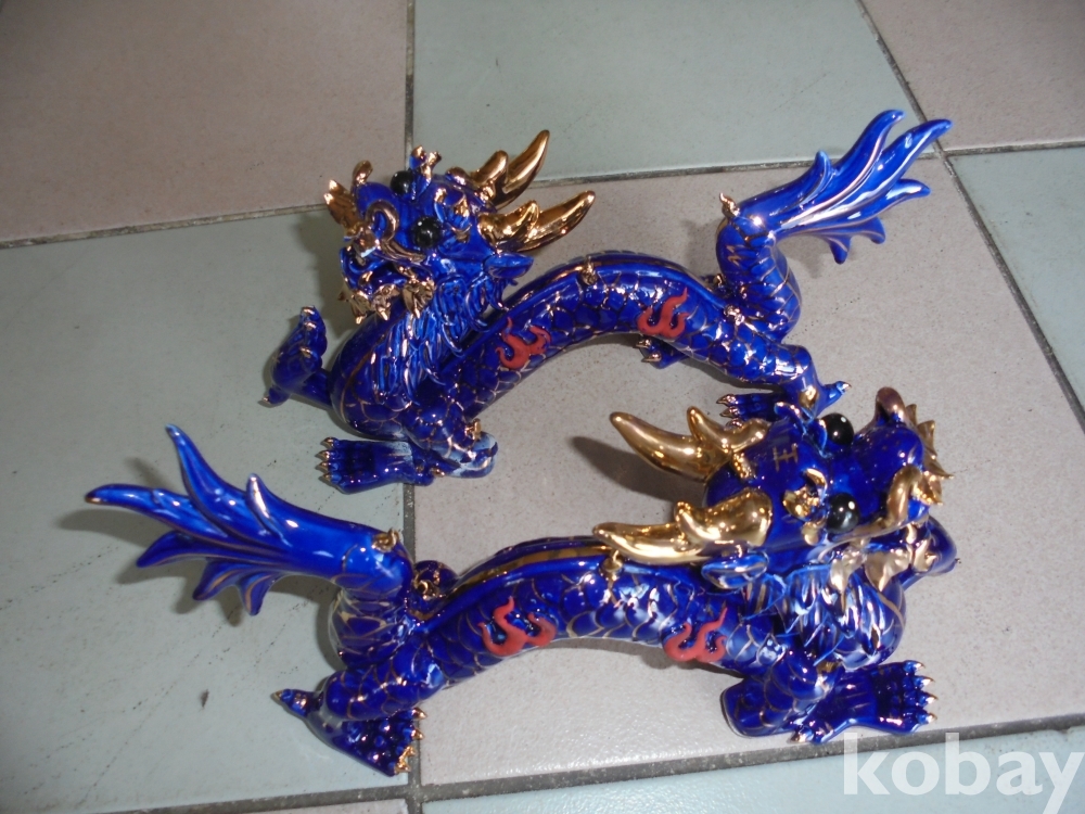 인간에 인망을 얻으면 승천한다는 용 황금색과 진푸른색상이 아주선명하야 곧승천하는것같은 살아있는 진청도자기 청용 2마리