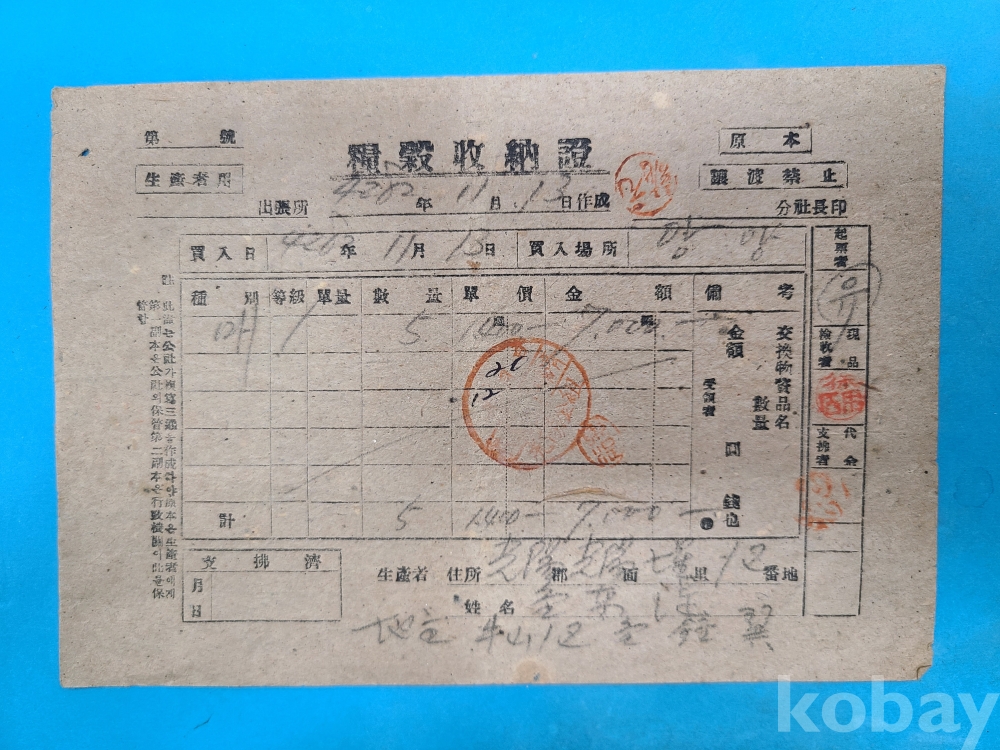 **** 1949년 光陽郡 糧穀收納證 매입일은 1949년11월13일이며 수량은 5가마, 단가는 1400원 이다 생산자는 광양군 광양면 칠량리 김동수 이다