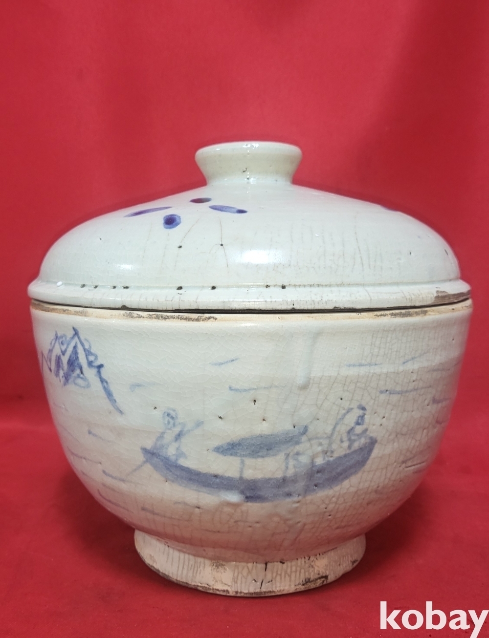 조선시대 청화백자(靑華白磁)로 빚은 산과 3척의 배(船) 문양 큰 합입니다,