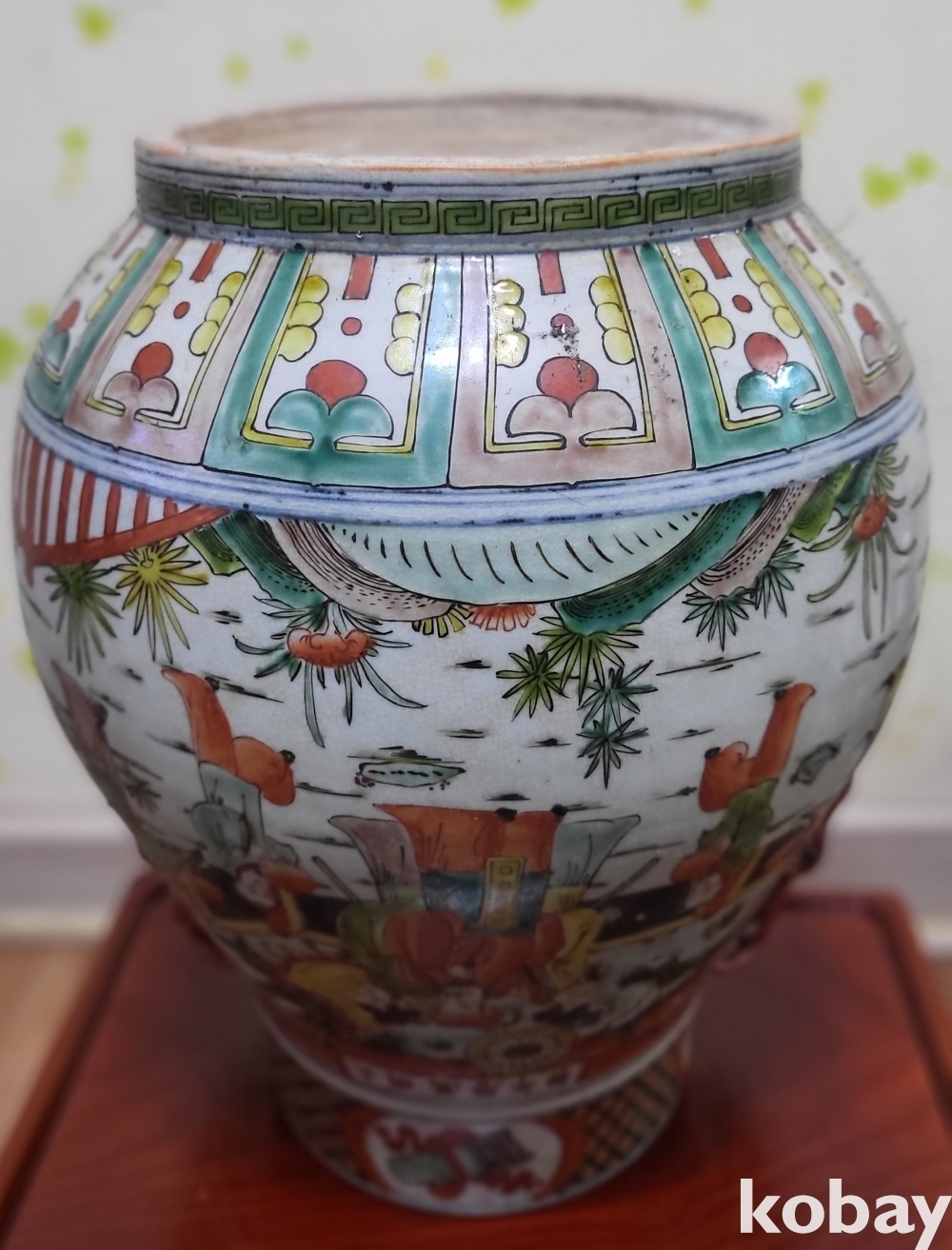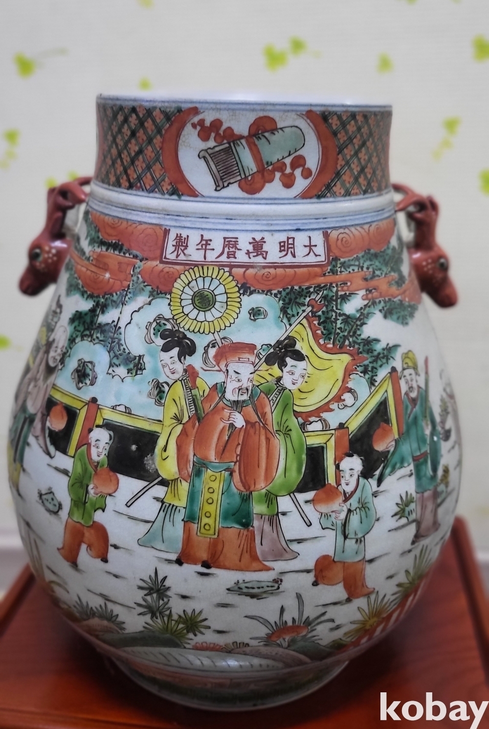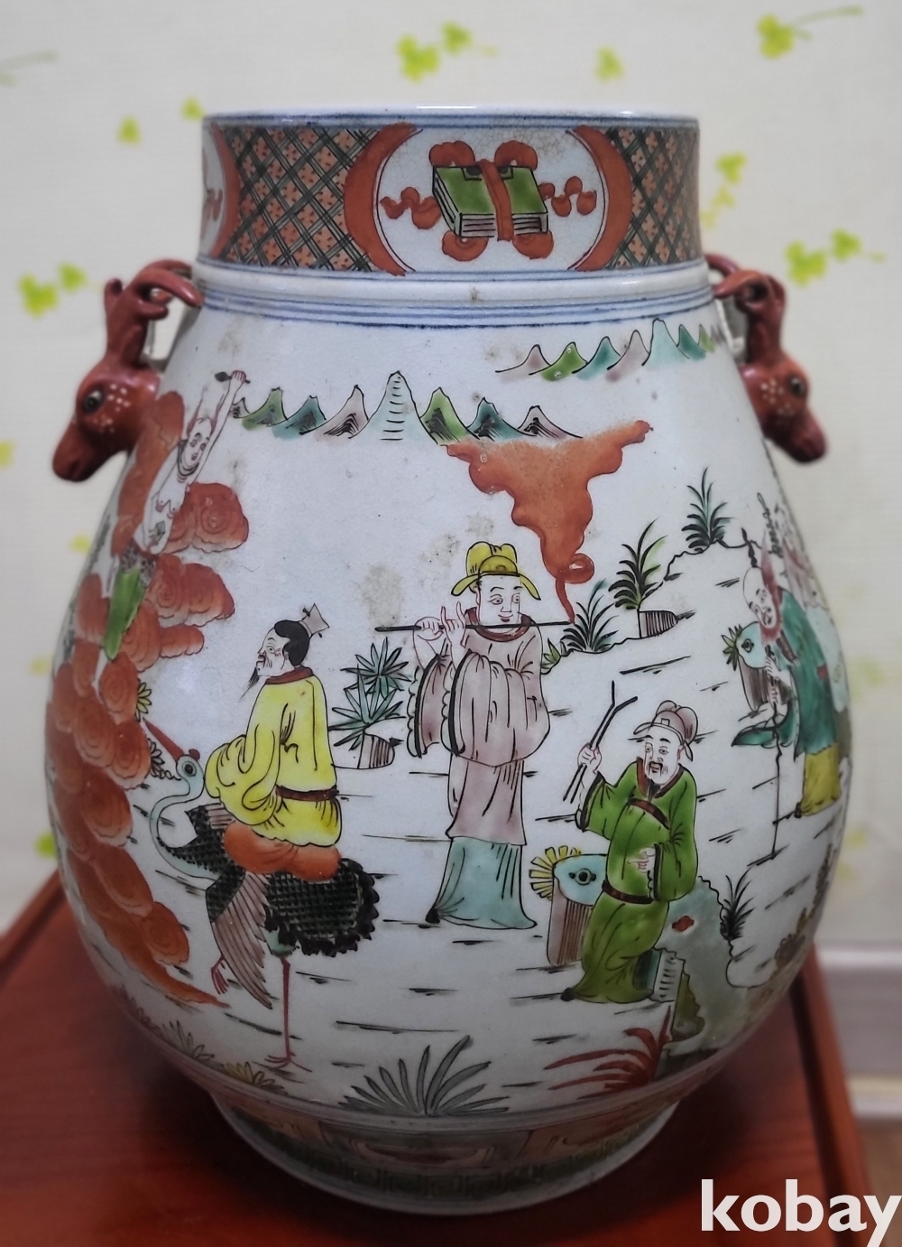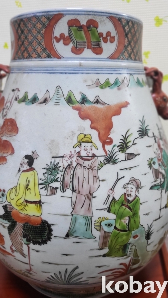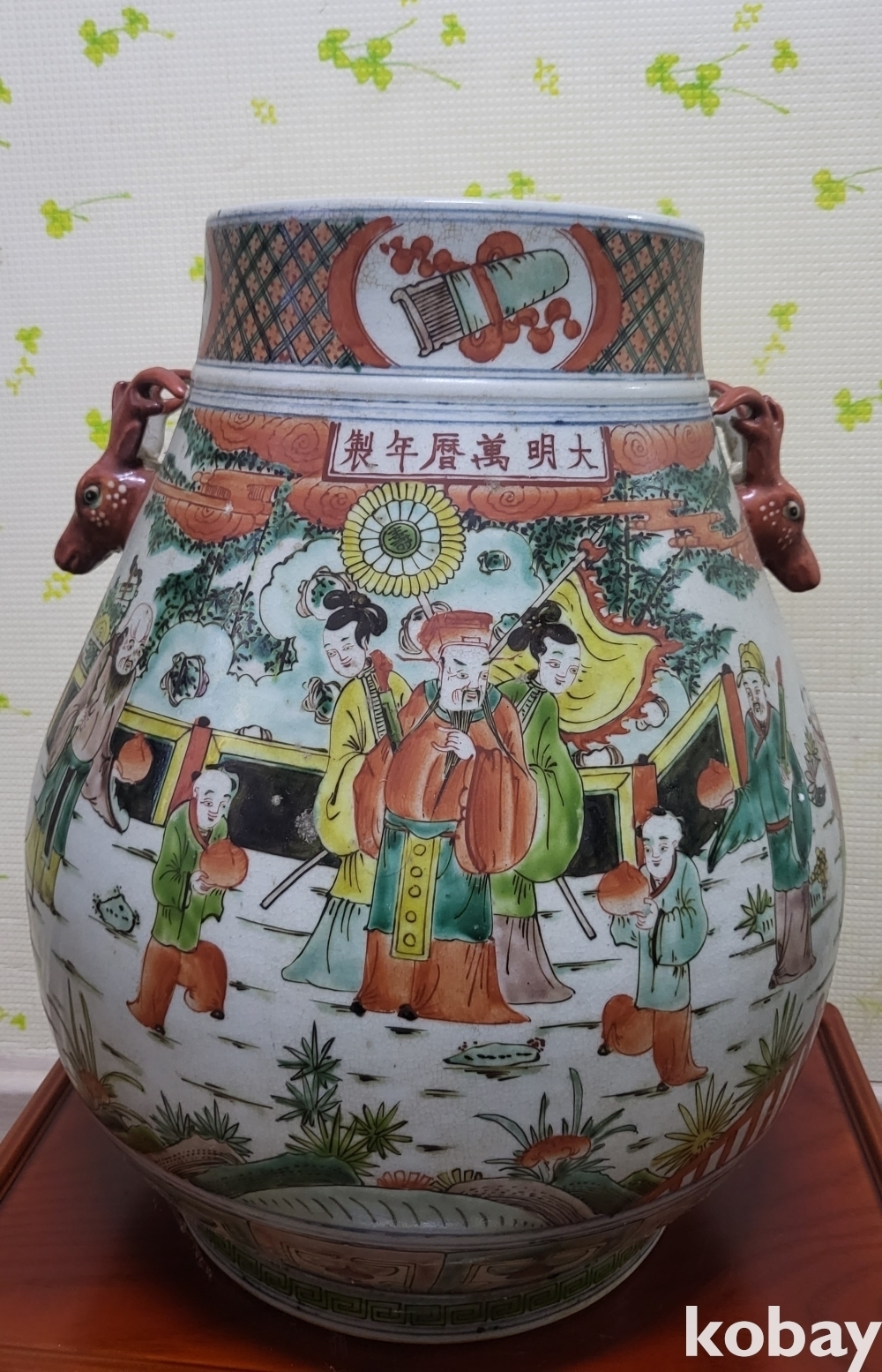 대명 만력연제 관지 청화 유리홍 발색이 빼어난 인물고사도 문양 양쪽 귀가 달린 큰 관입니다,