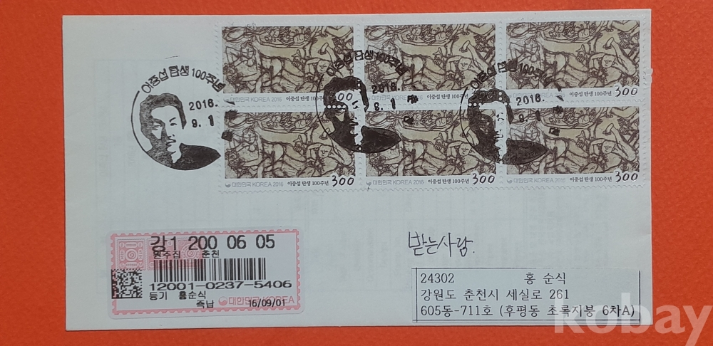 2016년 1월 1일 발행 이중섭 탄생 100주년 기념 초일봉피 입니다.