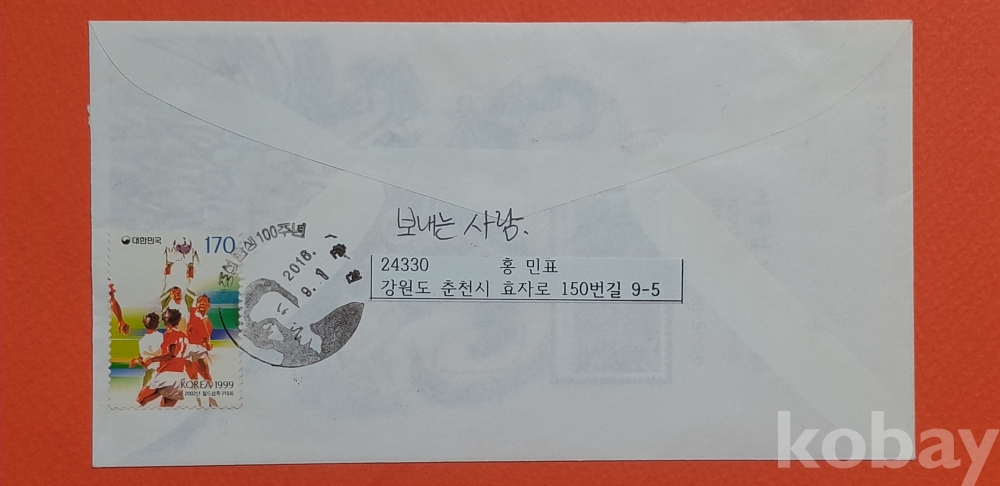 우표 6매와 뒷면 2002년 월드컵 우표 1매가 첩부되어 있습니다.