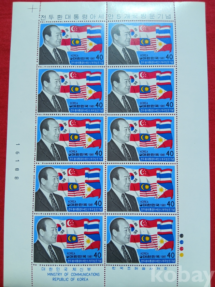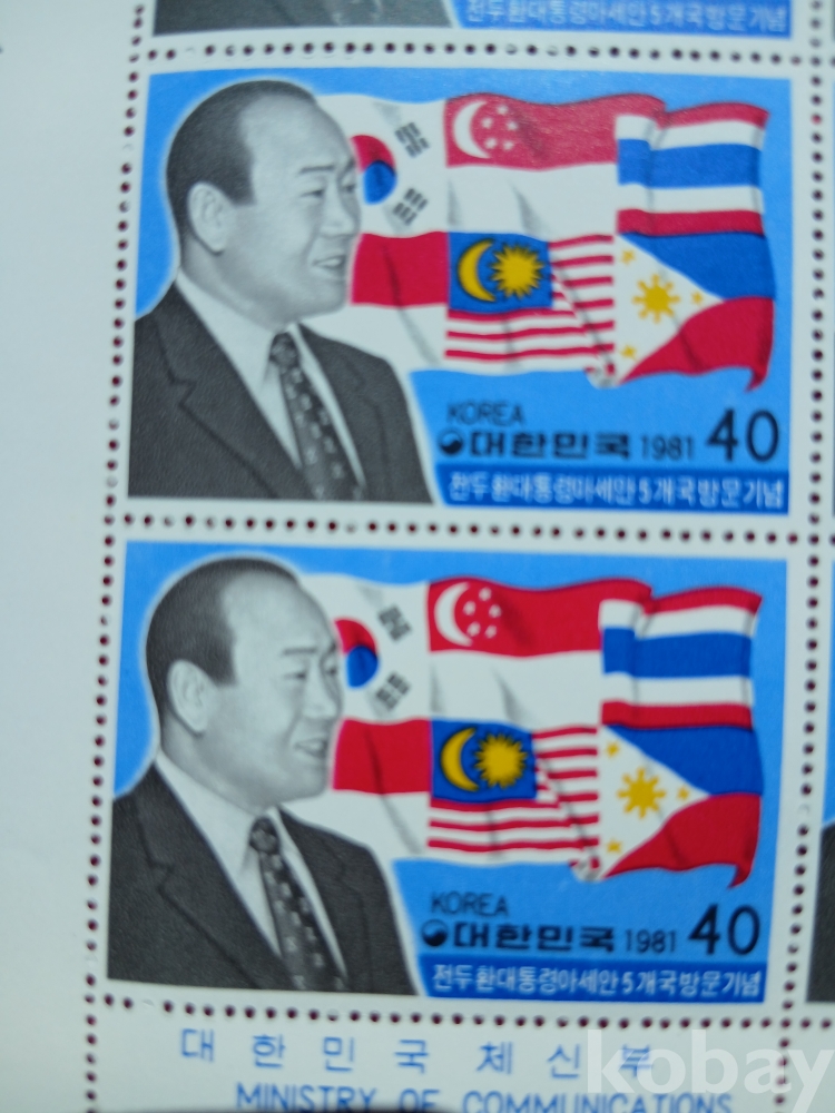 우표:전두환 대통령 아시안 5개국 방문 기념 우표 전지 (1981년.액면가 400원)----미사용으로 아주 양호합니다