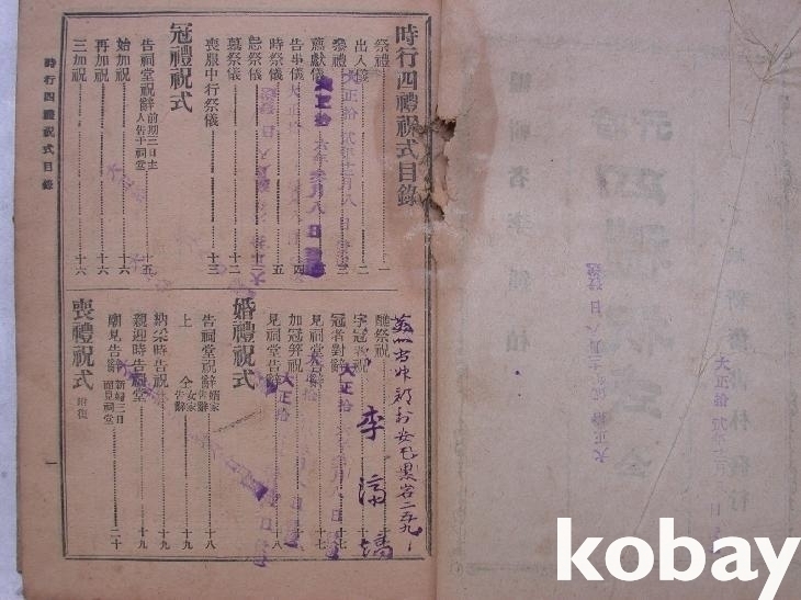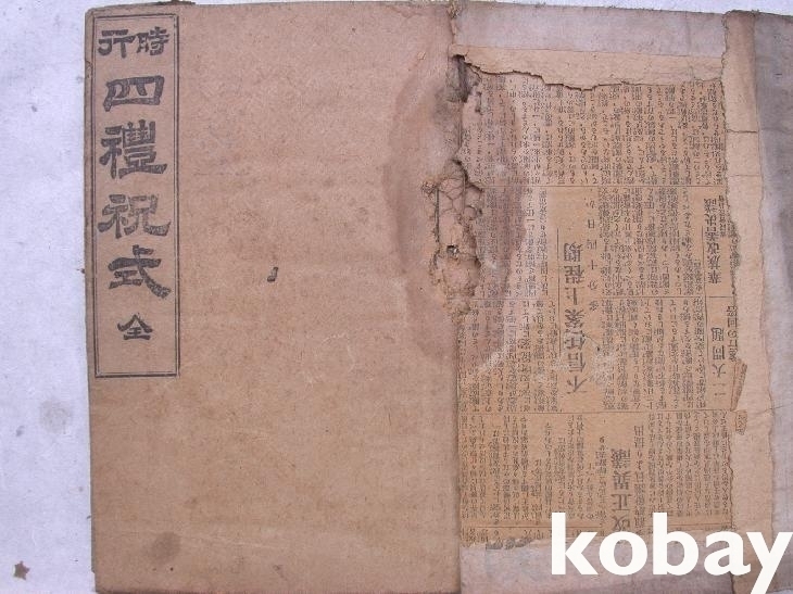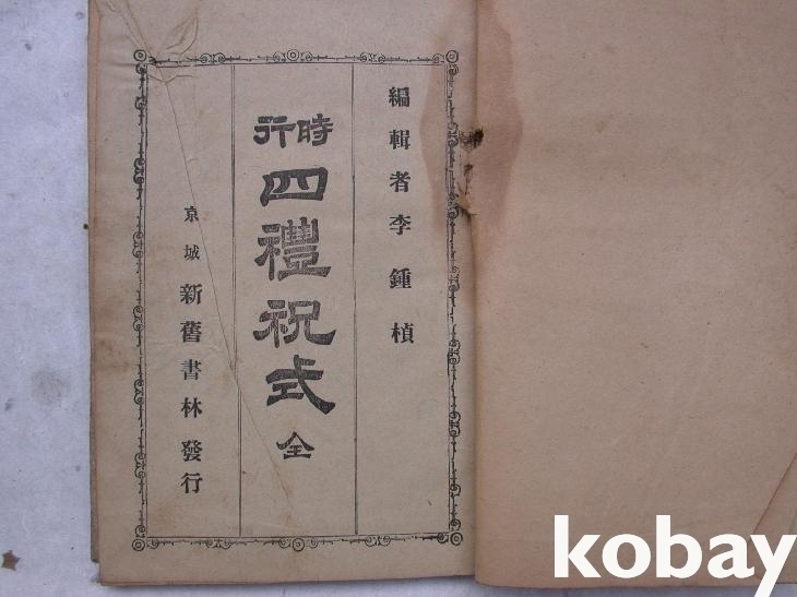 ▒ 표지에 <사례축식 전(四禮祝式全) >이라는 제목이 묵서되어 있으나 그 뒤에 있는원래의 표지에는 좌측상단으로 <시행 사례축식 전(時行四禮祝式全)>이라는 제첨이 붙어 있다. 배접해 덧댄 나중 표지는 뒤표지에 들춰보면 <大阪 每日新聞>이란 신문지 제호와 책이 발행된 이듬해 날짜가 보인다. 뒤에 간기가 있다. 저작 겸 발행자가 이종정(李鍾楨)이라고 되어 있으며 대정 6년(1917년) 경성부의 신구서림에서 초판이 발행되었고 2년 뒤인 1919년 6월 25일에 3판으로 발행된 판본이다.
