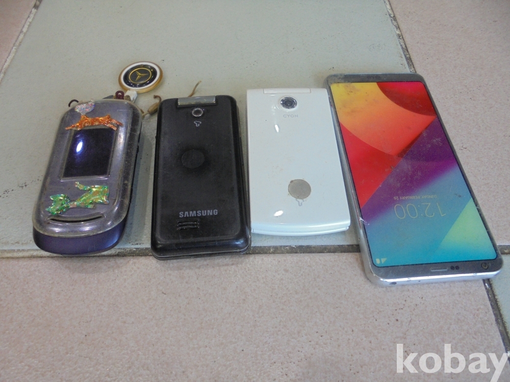오래된 중고 폴더폰 3점과 전시용 스마트폰 1점 총 4점 스마트폰 가로세로 7 x 15 cm 외사진참조