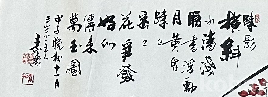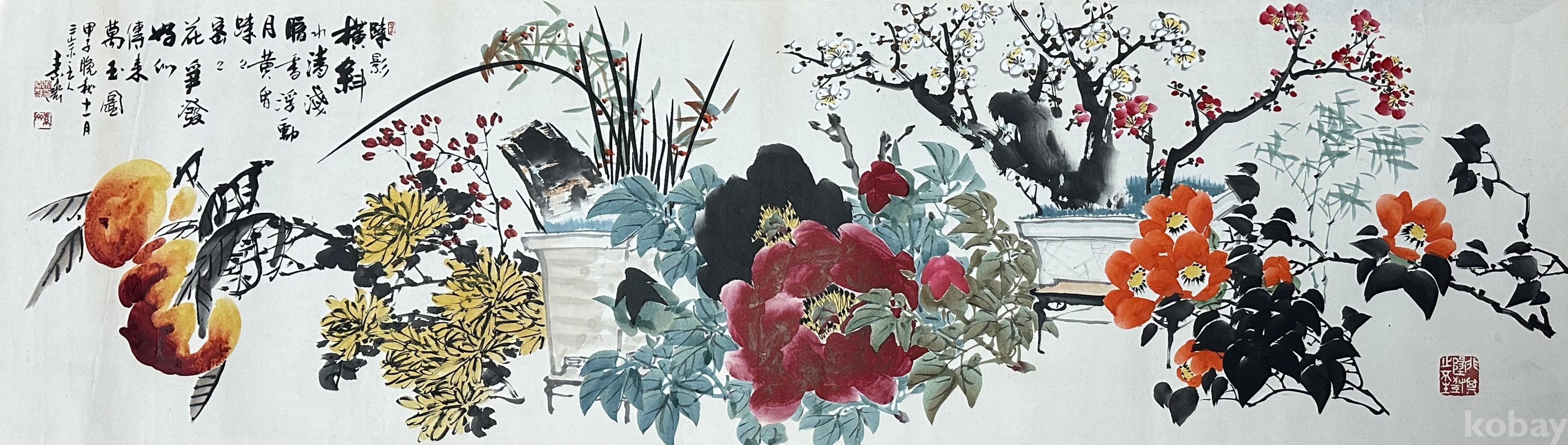 사계절을 상징하는 복숭아, 국화, 목단, 매화, 동백 등을 한 화면에 조화롭게 담아낸 전통 수묵채색화입니다. 다채로운 색감과 유려한 필치가 조화를 이루며, 건강·장수·번영을 상징하는 길상 소재들로 구성되어 있어 공간의 기운을 밝히는 길화(吉畵)로도 사랑받는 작품입니다. 거실·현관·사무실 등 어디에 걸어도 운치를 더해주는 대형 화병도 작품입니다.