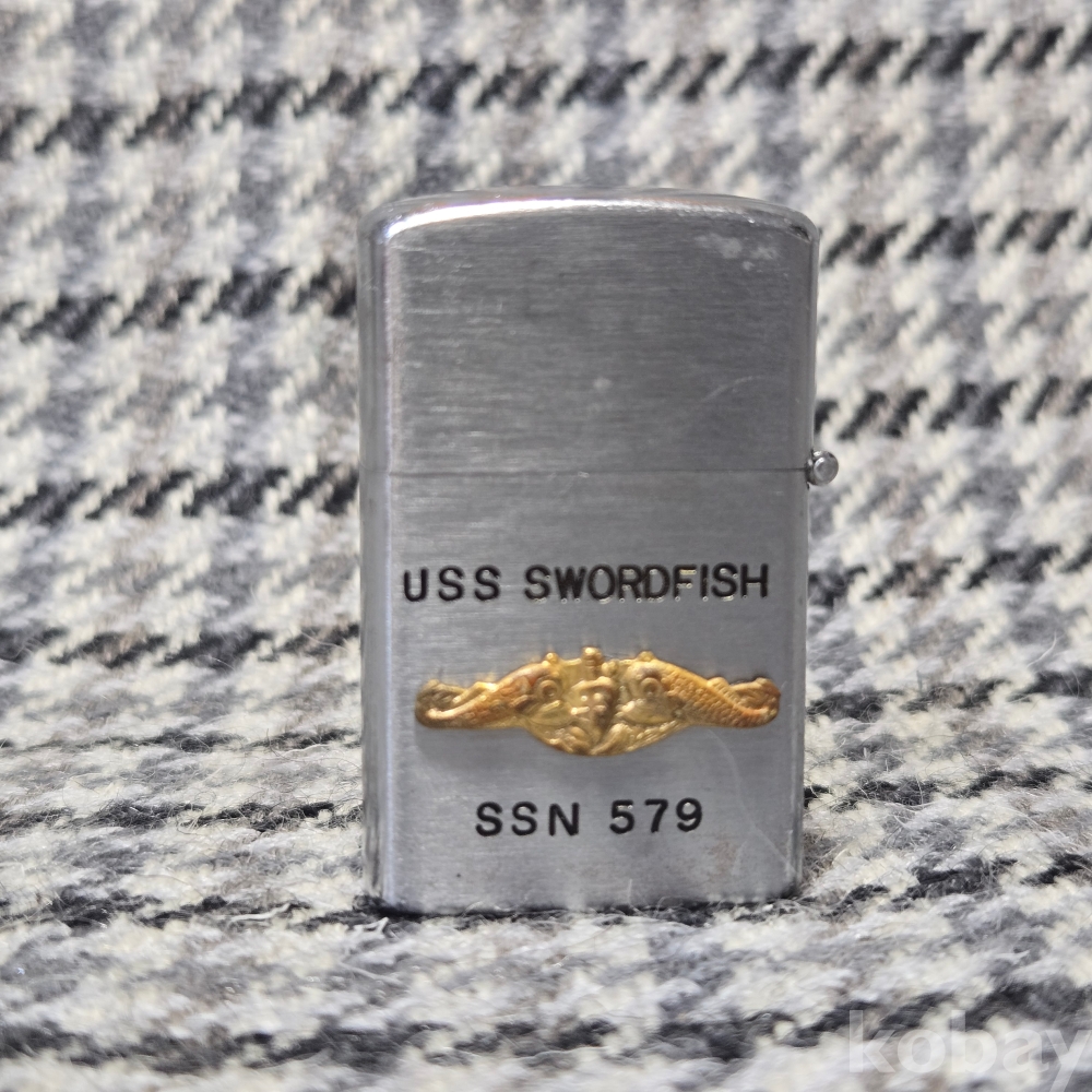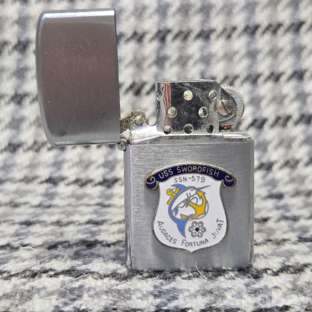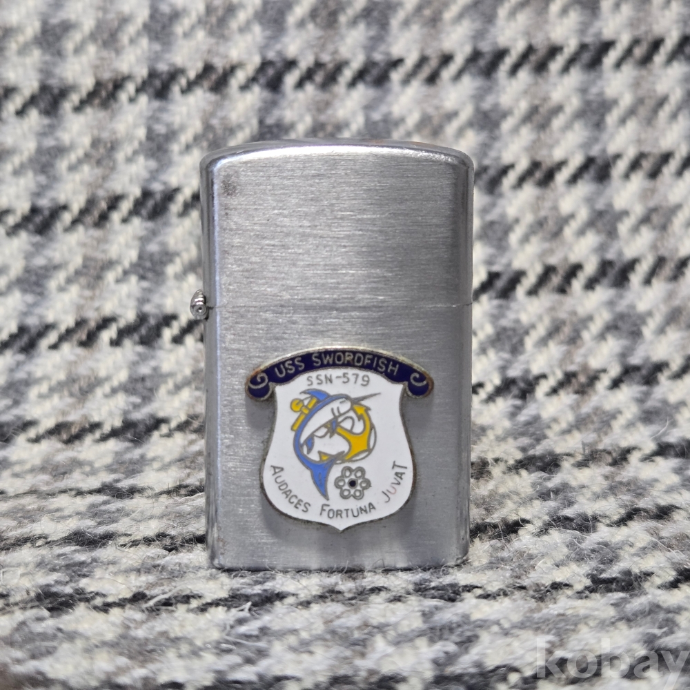 미국 해군 잠수함 USS 소드피시(SSN-579)의 문장이 새겨진 라이터입니다. USS 소드피시(SSN-579)는 1957년 8월 27일에 진수된 스케이트급 핵추진 잠수함입니다. 잠수함의 모토인 "Audaces Fortuna Juvat"을 포함하고 있으며, 이는 "행운은 용감한 자를 돕는다
