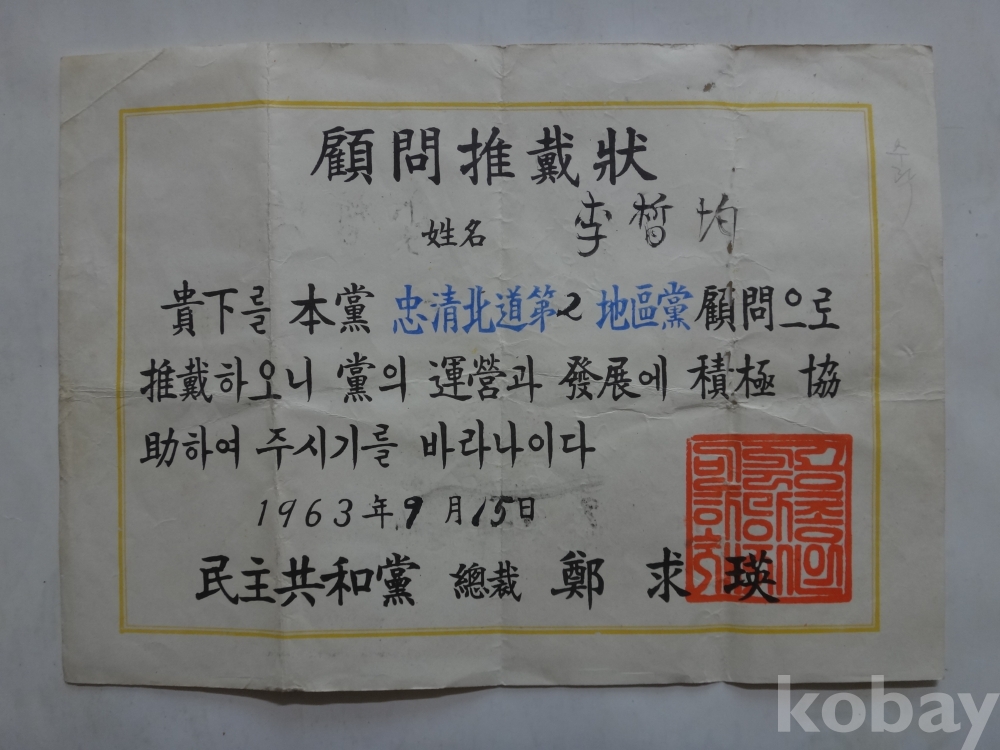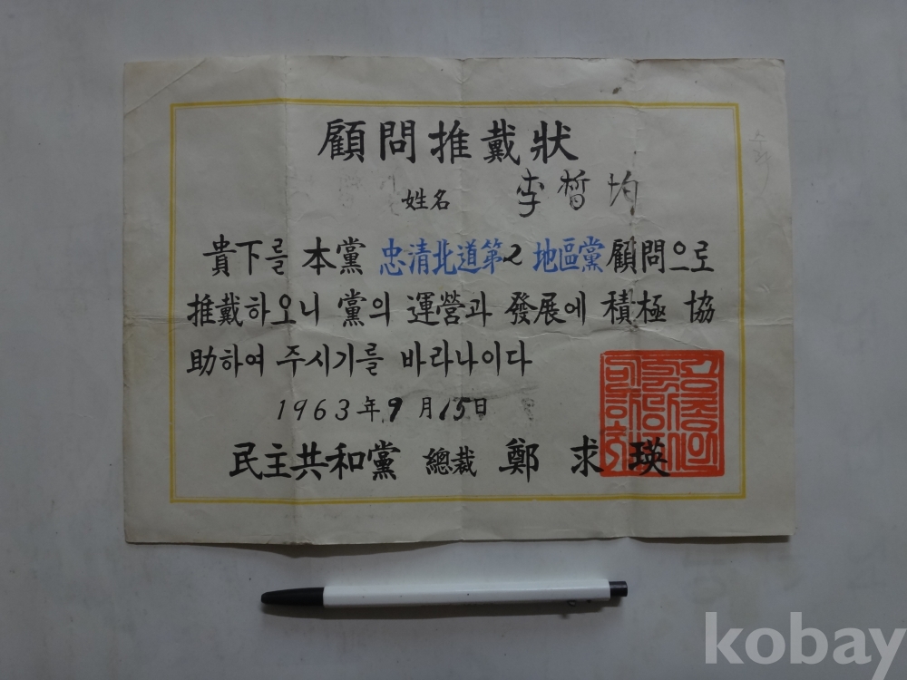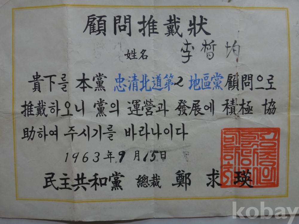 민주공화당 - 고문 추대장 (1963년, 충청북도 제2지구당 고문)