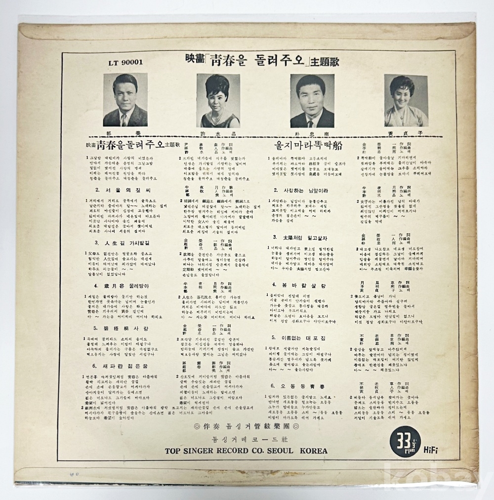 상품 설명 | Side A 1. 청춘을 돌려주오 2. 서울의 짚씨 3. 인생길 가시밭길 4. 세월은 물레방아 5. 벽오동 사랑 6. 새파란 젊은 꿈 Side B 1. 울지마라 똑딱선 2. 사랑하는 님앞이라 3. 태양처럼 밀고살자 4. 봄바람 살랑 5. 이름없는 대포집 6. 오둥둥 청춘 | ||