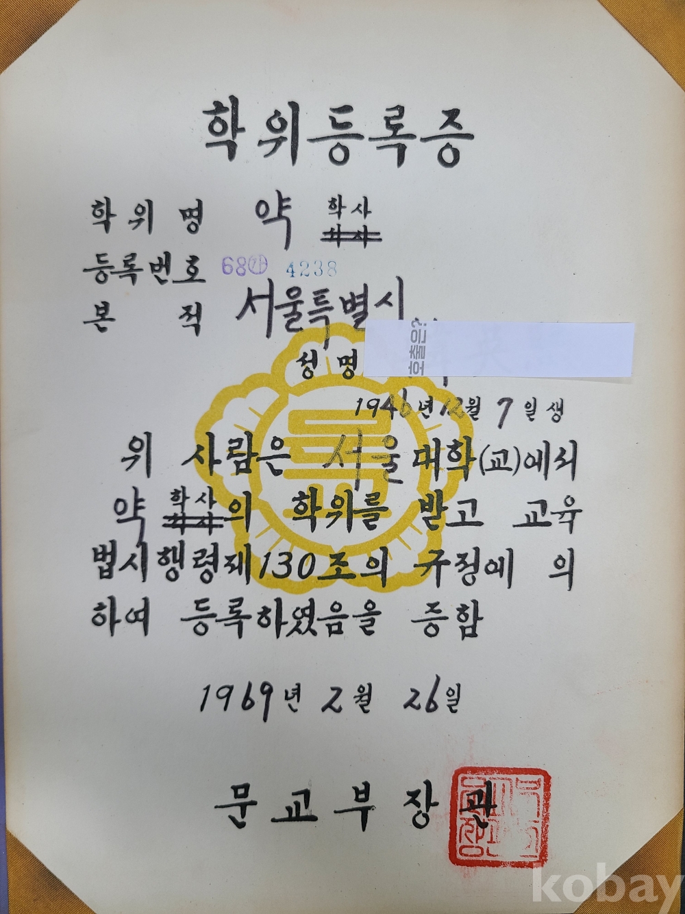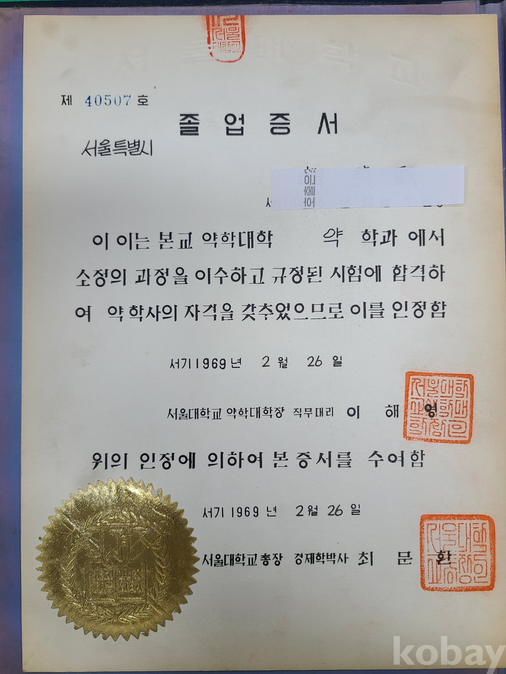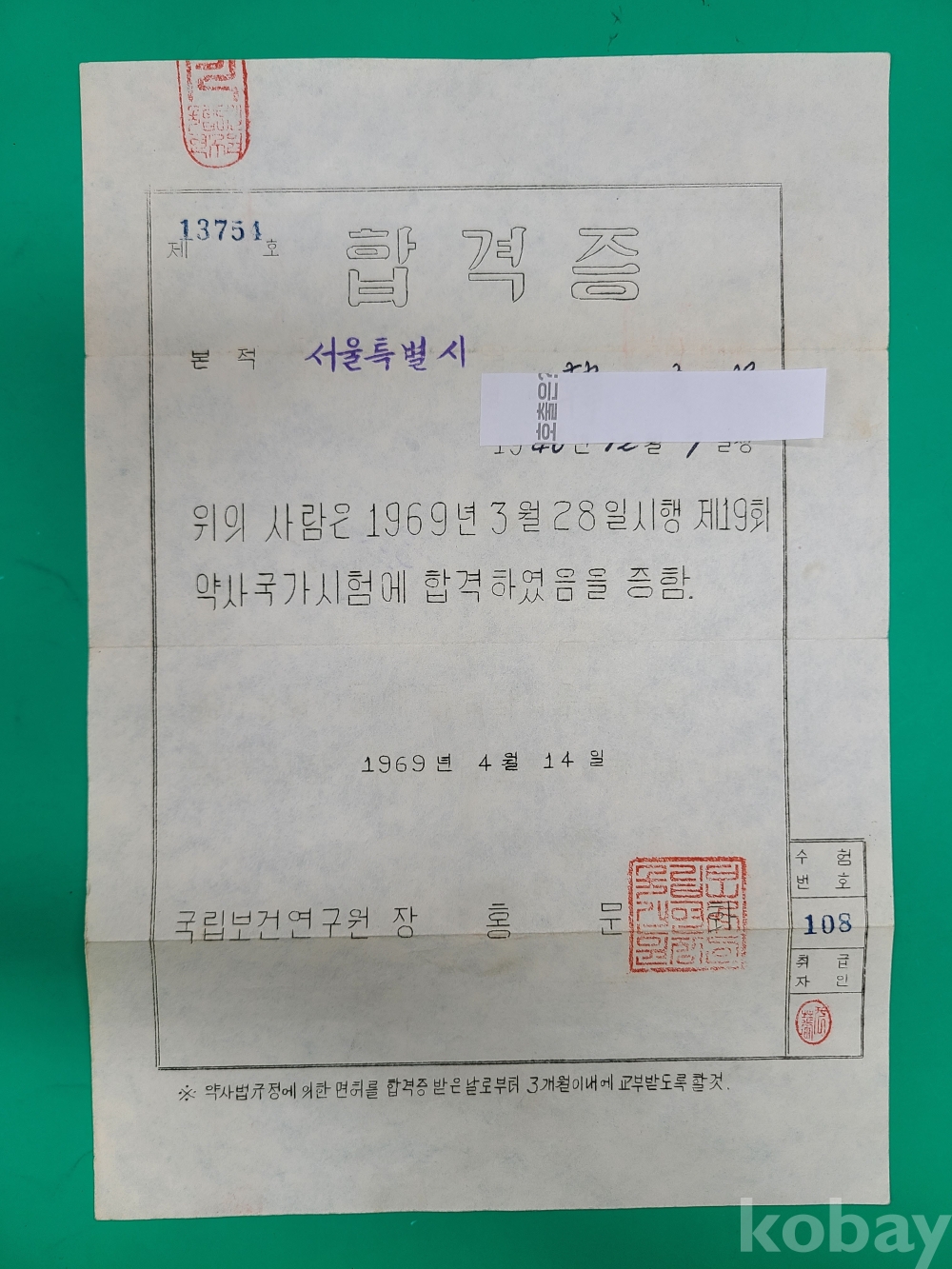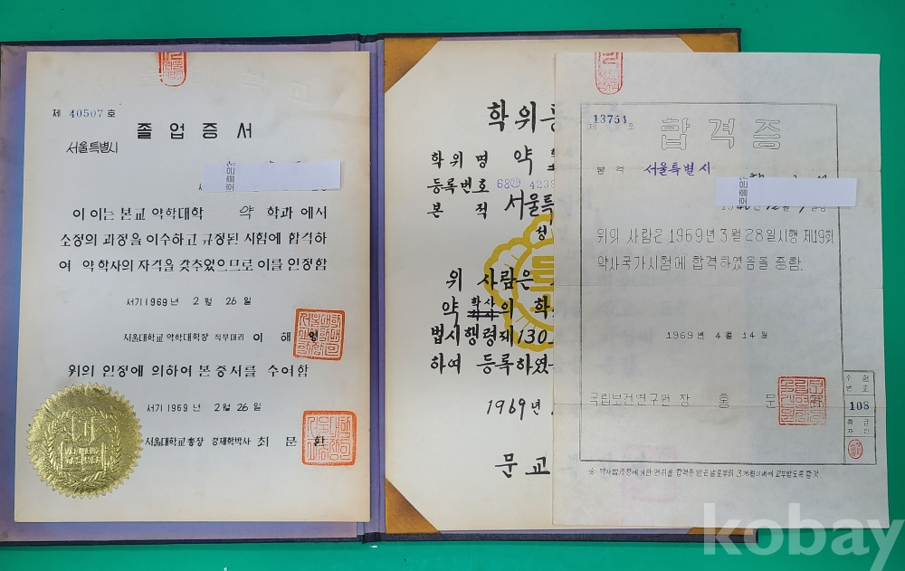 [약학] 1969년 서울대학교 졸업증서,학위등록증,약사국가시험 합격증