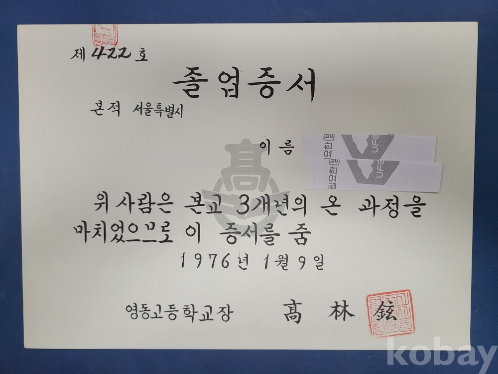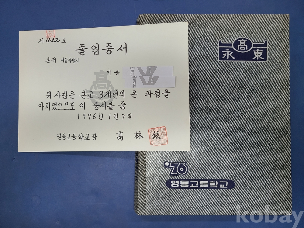 1976년 영동고등학교 제1회 졸업기념 앨범,졸업증서