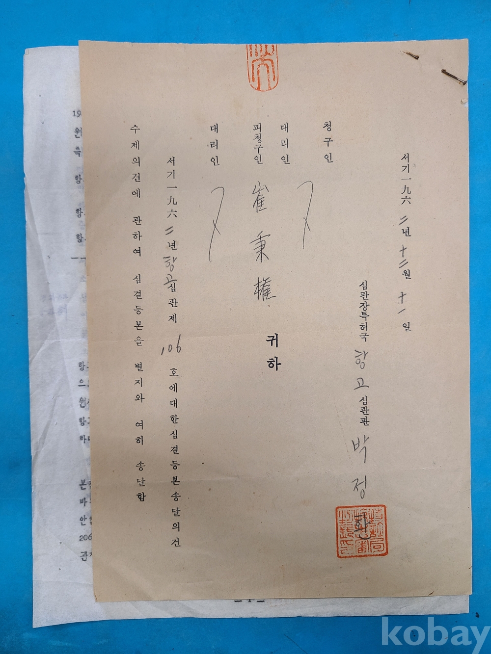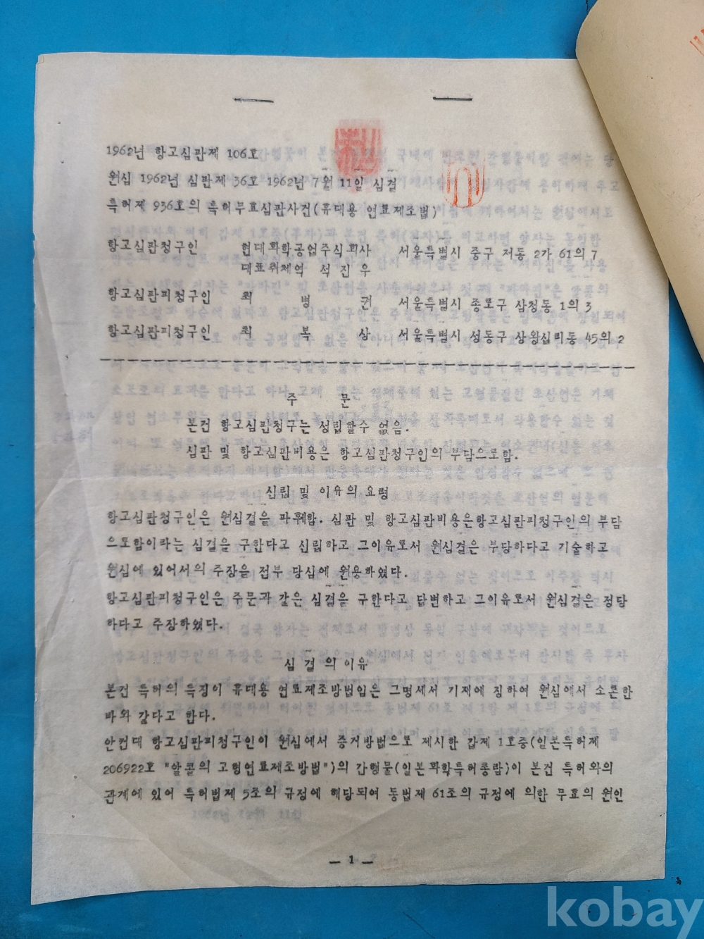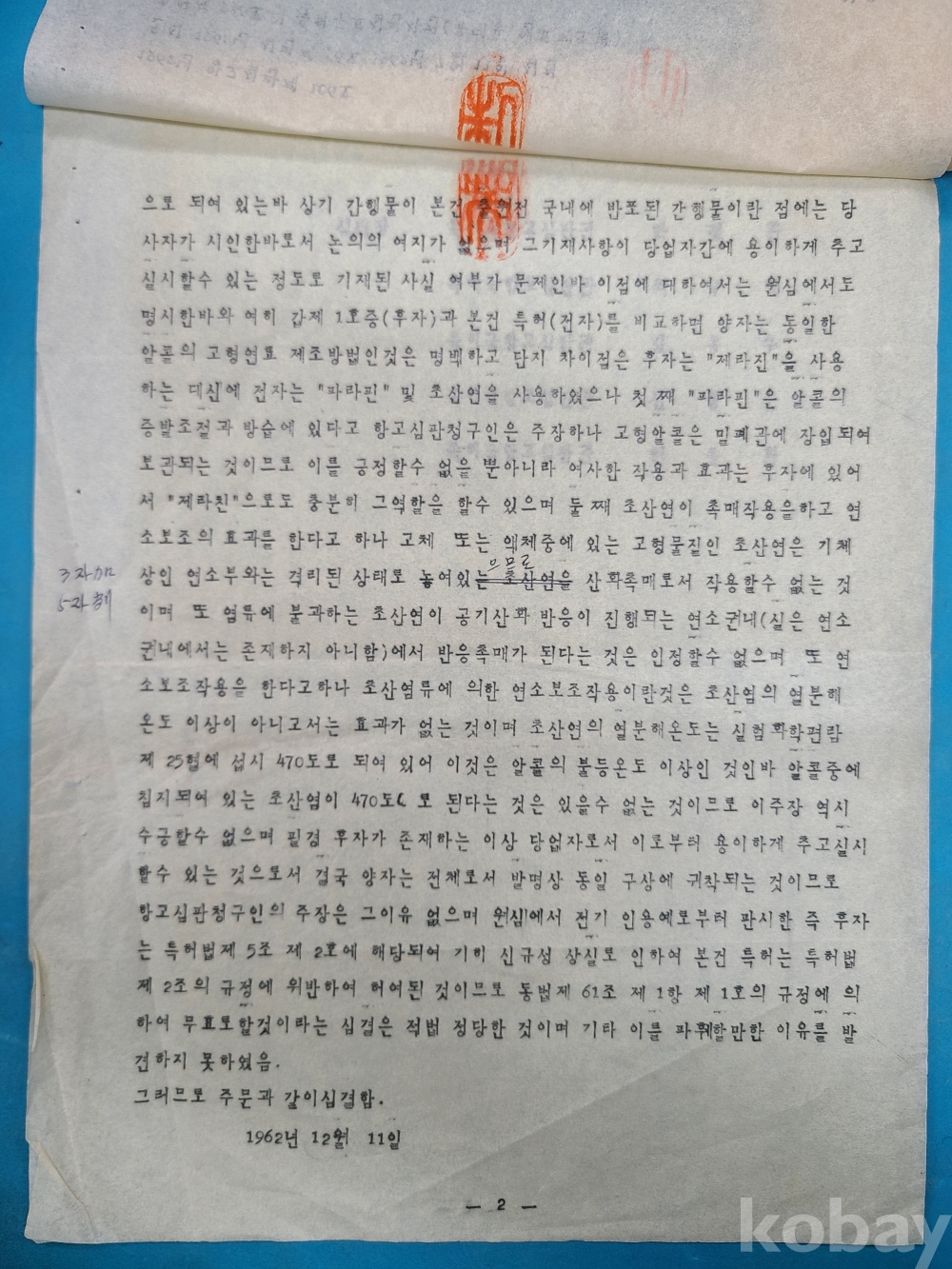 **** 특허무효심판사건 항고심판 (1962.12.11.) 특허제936호의 특허무효심판사건 (휴대용 연료제조법)
