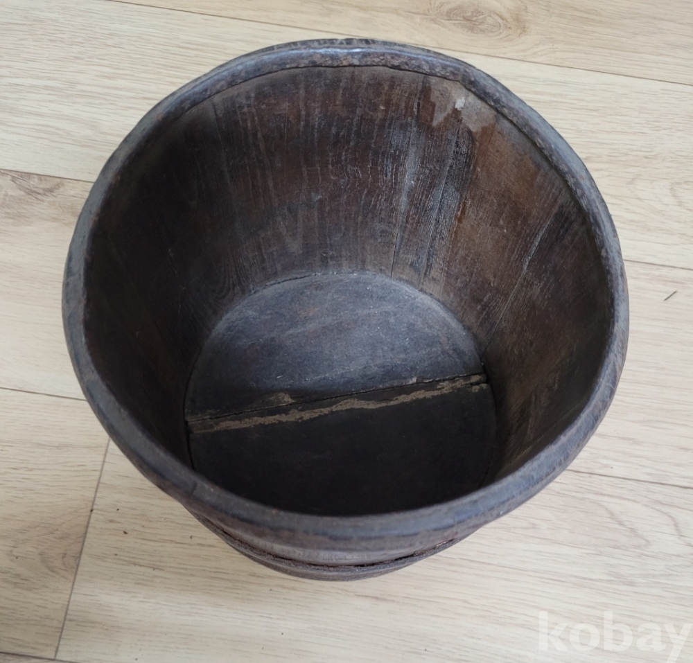 상단과 하단에 나무 또는 금속 띠가 둘러져 있어 형태를 고정하고 있습니다. 나무 표면에는 깊은 나뭇결과 함께 오랜 세월 사용되면서 생긴 마모, 갈라짐, 그리고 검게 변색된 부분이 두드러집니다.