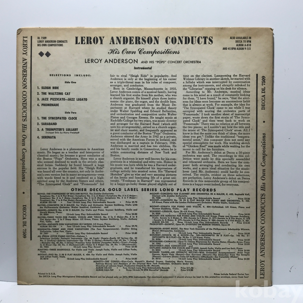10인치 LP 90,060-33 LEROY ANDERSON CONDUCTS His Own Compositions LEROY ANDERSON AND HIS POPS CONCERT OR . 자켓 EX 알판 EX 수입반