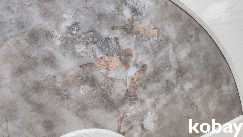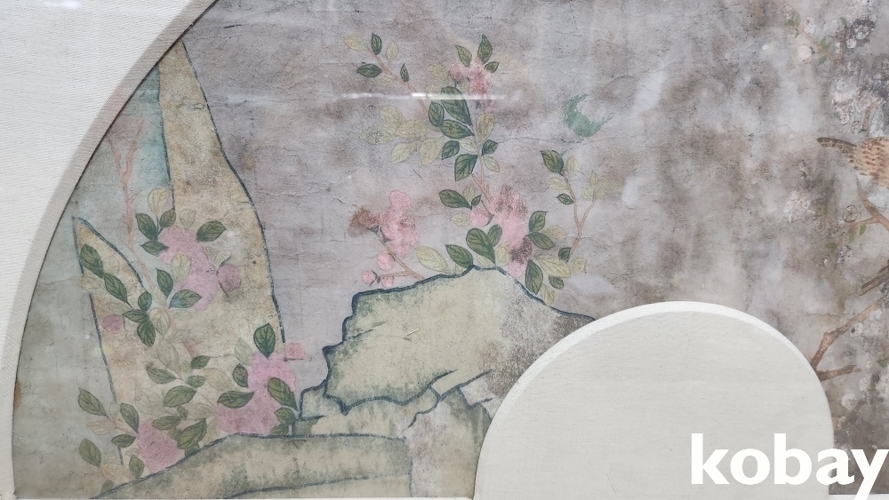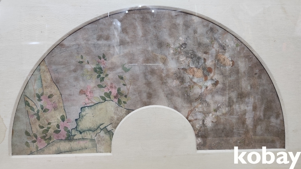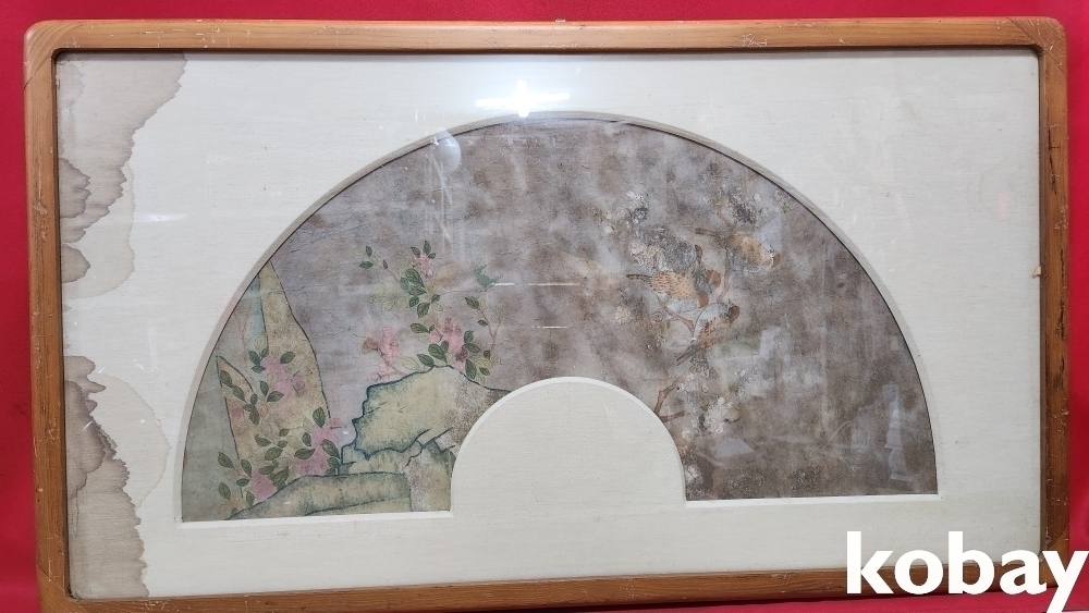 강점기 연대 보이는 당채로 그려진 꽃과새 선면도입니다,