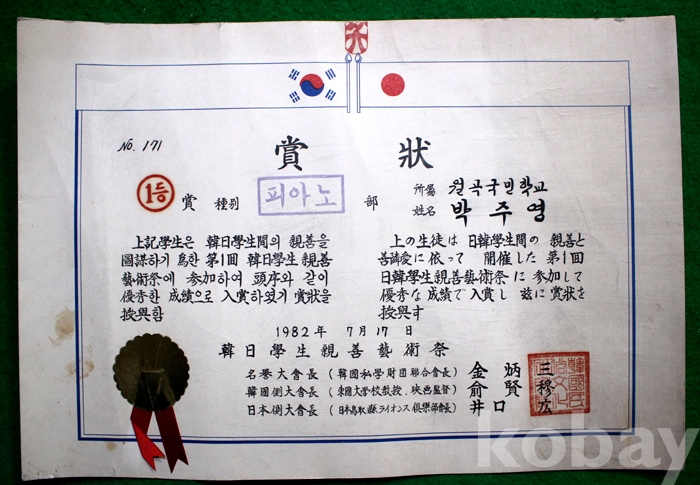 (상장 및 졸업장) 1982년 제1회 한일학생 친선예술제의 상장 - 피아노 1등
