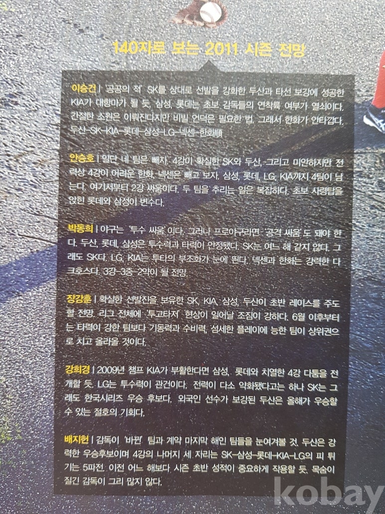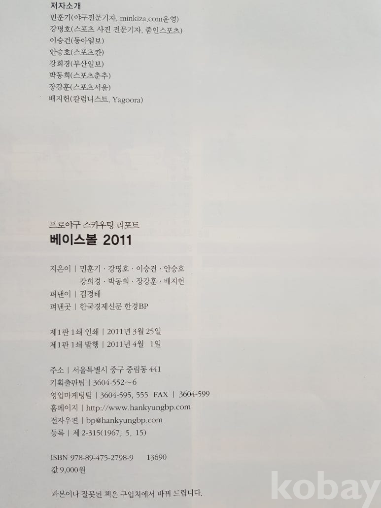 저자: 한국경제신문 야구팀, 발행처: 한국경제신문 , 발행일: 2011년 3월25일 , 규격: 19 * 25.5cm , 페이지: 185 , 상태: 연륜이 있지만 상태 최상급 , 정가: 9.000원 , 수량: 1권