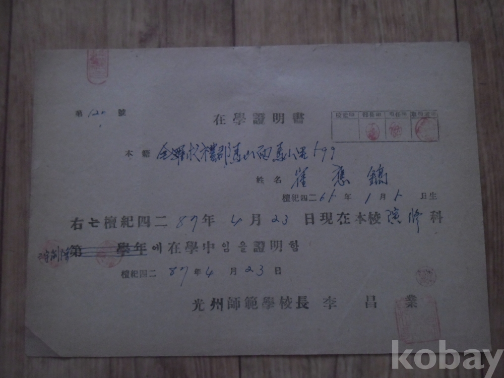 1954년 광주사범학교 재학증명서