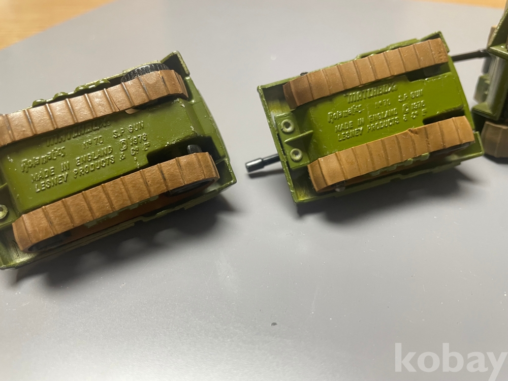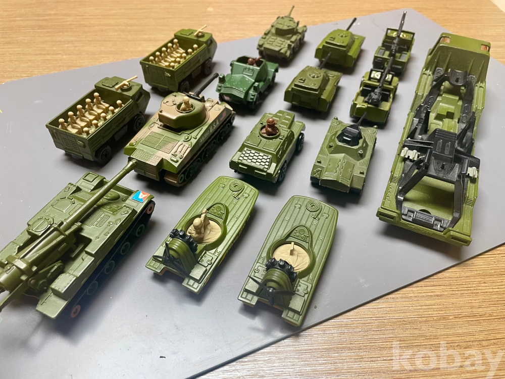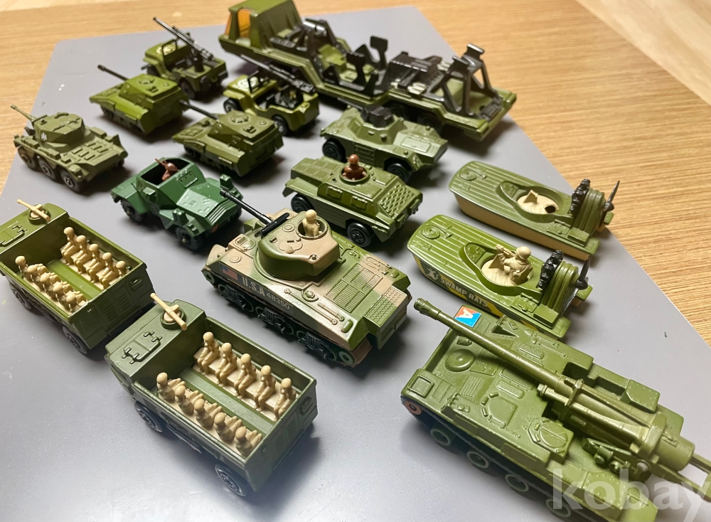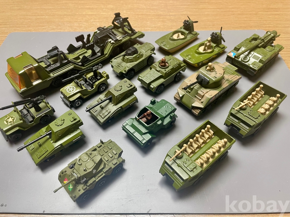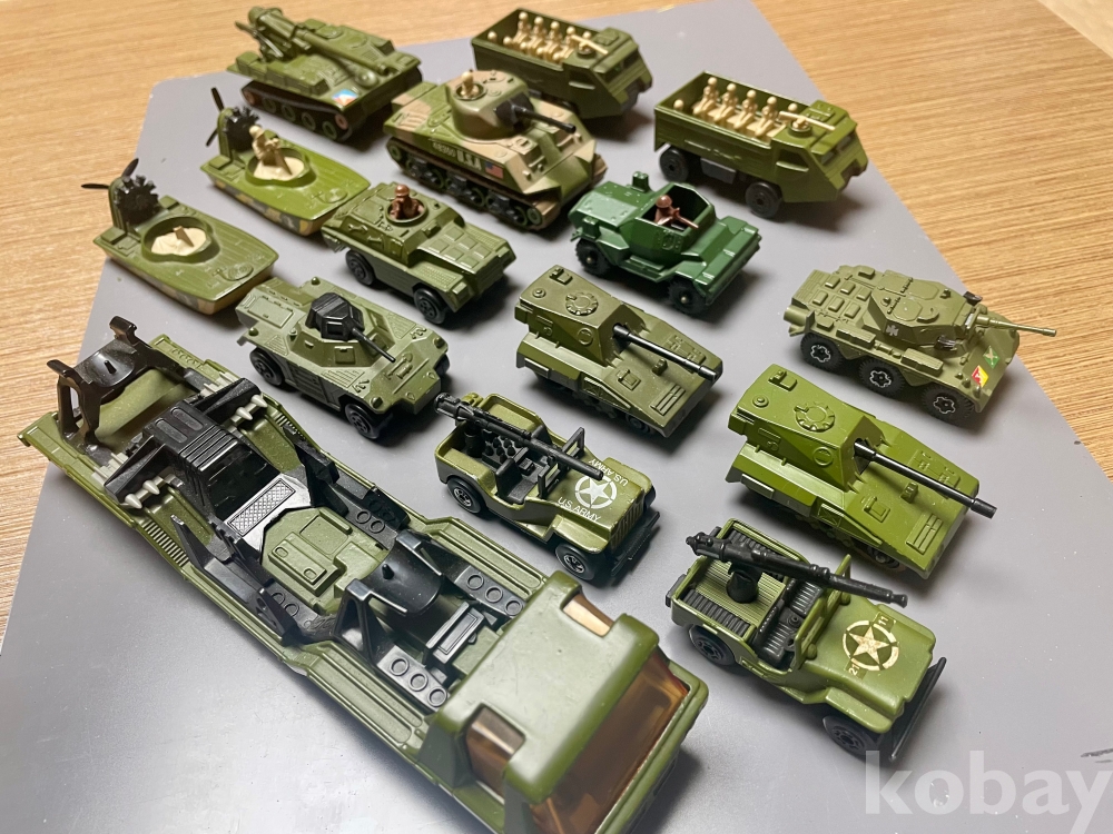 대부분 74년 매치박스 (영국제) 제품이며 코기(corgi) 6륜 장갑차 (홍콩제조)와 핫휠 무반동포 짚 으로 구성되어 있습니다