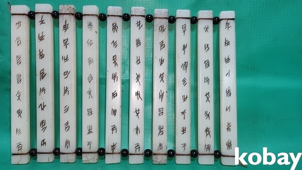 백옥(白玉)에 음각 고대 문자가 새겨진 10개묶음 백옥간(白玉簡)으로불빛이
