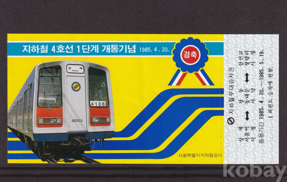 - 서울특별시 지하철공사 - 1985년 4월 20일 지하철 4호선 1단계 개통 기념 승차권