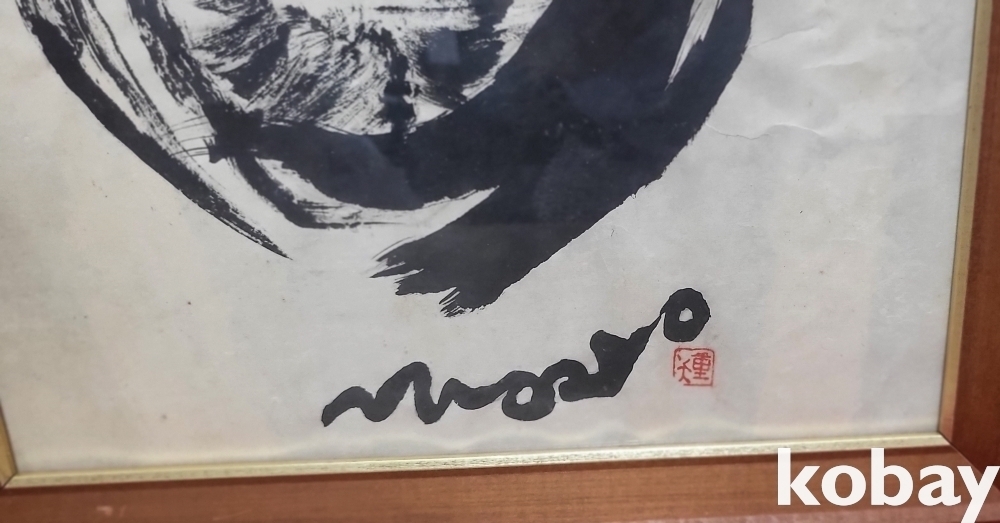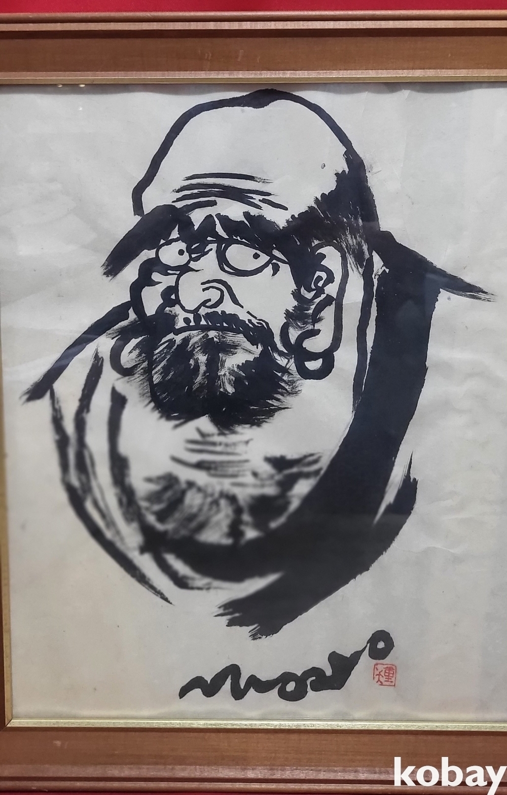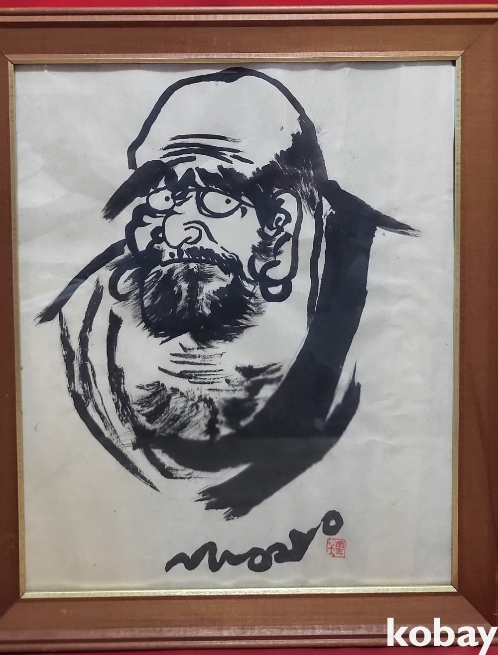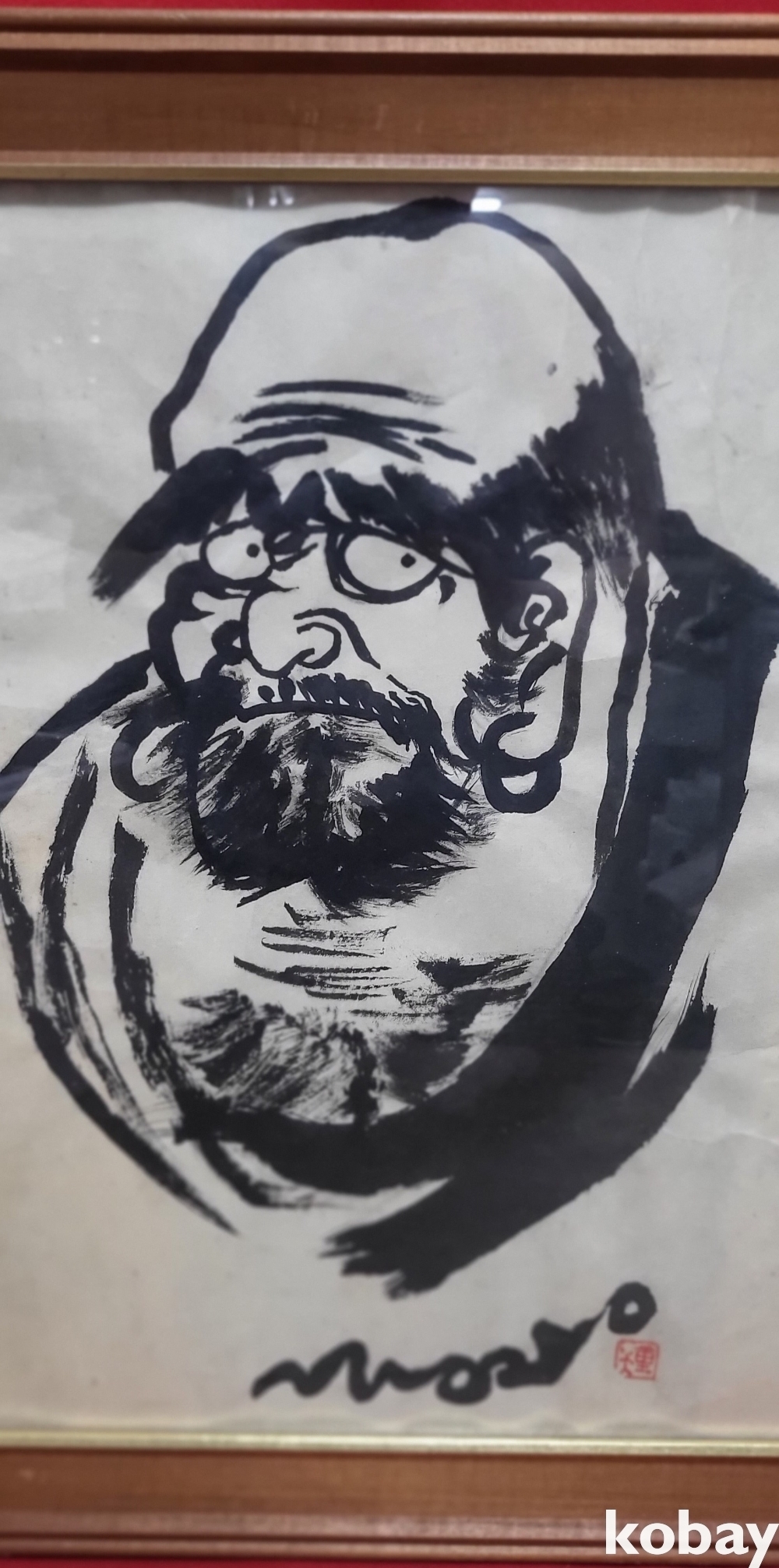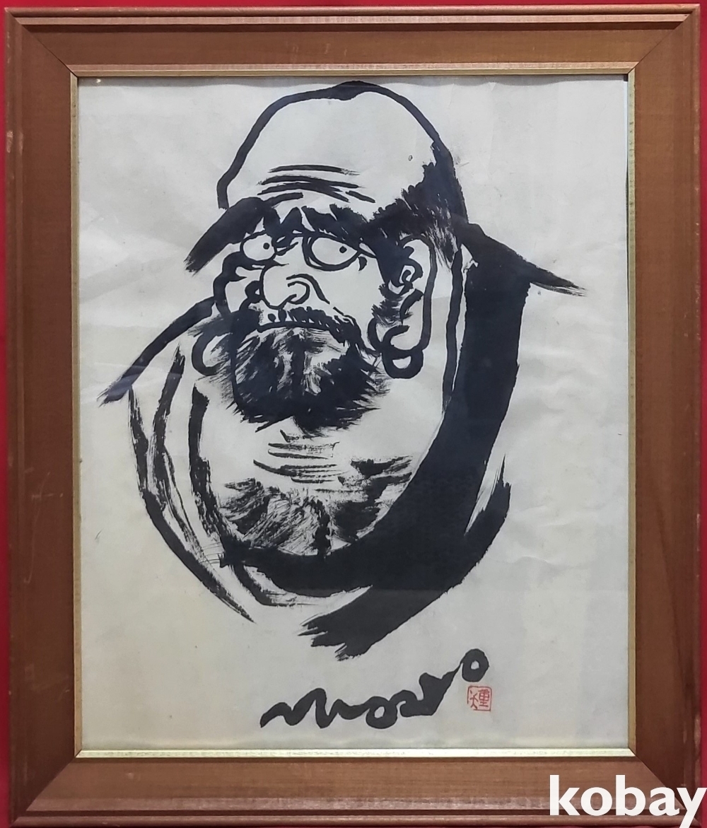 중광 사인이 보이는 종이에 먹(墨)으로 완성된 달마상입니다,